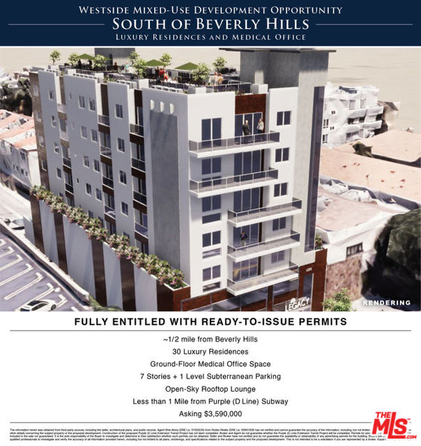 Attention Developers & Builders! RTI (Ready-to-Issue) Permits in Hand - Break Ground Immediately! Offered at approximately $115K per unit, this mixed-use development opportunity is located just blocks from Beverly Hills and less than 1 mile from the future Purple Line Subway Station. This approved 7-story architectural project features: 30 Luxury Residences, plus a Medical/Dental Office space, and an Open-sky Rooftop Lounge offering residences breathtaking views of the city. With RTI permits already secured, this project is ready to break ground. If you're ready to start immediate construction and to redefine the local skyline, contact me for more details and access to the approved plans.