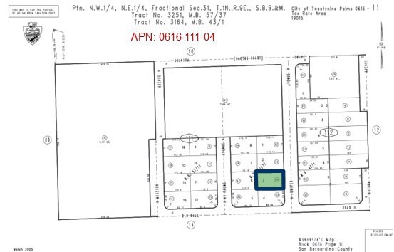 Residential Lot, 0.19 Acres (APN: 0616-111-04) GPS: 34.132086, -116.07748 This residential lot is located in Twentynine Palms, CA. Twentynine Palms has zoned this property Residential (RS-4). The city has zoned the property for single family homes, with a maximum of 4 units per acre. Imagine building your desert getaway and waking up to bright desert sunrises, panoramic views of rugged mountains, or dark starry nights. Overhead electricity is on site. The Twentynine Palms Water District services the area and provides water in the street. Residents have septic tanks for their sewer needs. Living in Joshua Tree, CA, offers a unique blend of natural beauty and laid-back desert living. Endless opportunities for outdoor adventures are a short drive away in Joshua Tree National Park. There's always something exciting to explore. Plus, the tight-knit community fosters a sense of belonging, with local shops, art galleries, and events showcasing the area's vibrant culture. Whether you're seeking tranquility or adventure, Joshua Tree welcomes you with open arms. This property does not yet have an address. While the boundary lines on the map offer a glimpse, they are only approximate. A Buyer should verify boundaries, zoning and utilities, ensuring every aspect aligns with their vision for the property.