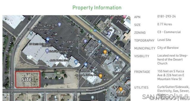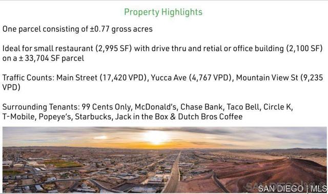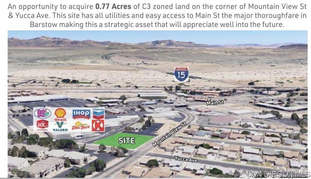 An opportunity to acquire 0.77 Acres of C3 zoned land on the corner of Mountain View St & Yucca Ave. This site has all utilities and easy access to Main St the major thoroughfare in Barstow making this a strategic asset that will appreciate well into the future.
