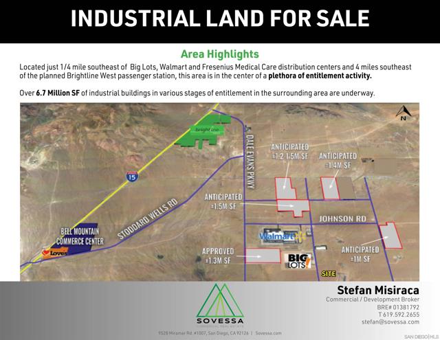 5.11 Acres of industrial land off Navajo Road on Needham Ave. Property lies within the North Apple Valley Industrial Specific Plan, an area where many land investors have acquired hundreds of acres in anticipation of future growth. Existing development includes Walmarts 1 Million square foot Distribution Center, the Regional Public Safety Training Center, Fresenius Medical Care Distribution Facility, Big Lots 1.4 Million square foot Distribution Facility with an estimated 400-500 new jobs and Ameritex Manufacturing Plant with an estimated 150 new jobs. Recently approved is a 1.3 Million square foot Furniture Distribution Facility next to Big Lots in addition to extensive infrastructure improvements for the area.