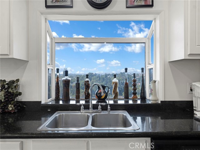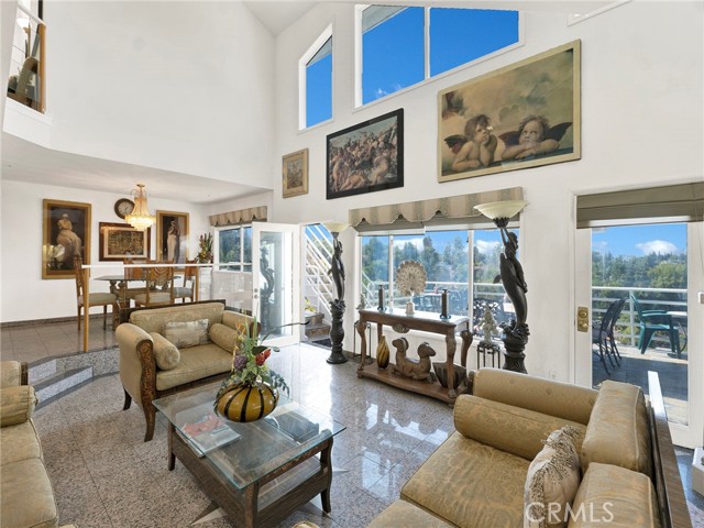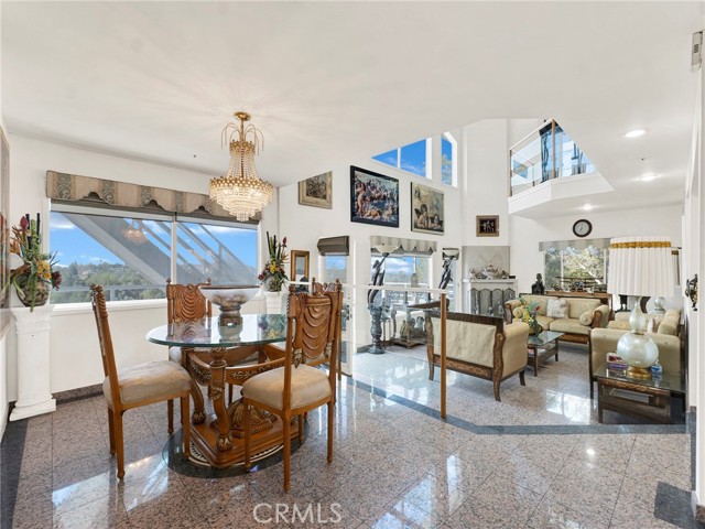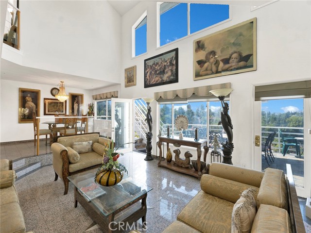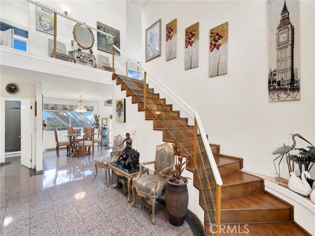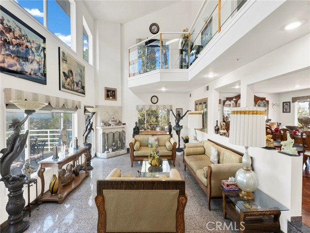 A double-door entry opens to a dramatic two-story foyer with a glass-framed staircase. The main level features a cozy reception area, a spacious living room with fireplace and walls of glass framing unobstructed valley and city-light views, an oversized formal dining room with wet bar, and a chef’s kitchen with generous granite counters, stainless steel appliances, and its own scenic balcony. Multiple decks and balconies flow seamlessly for both grand entertaining and everyday living. A symphony of windows, skylights, and glass doors bathes the interiors in natural light.
