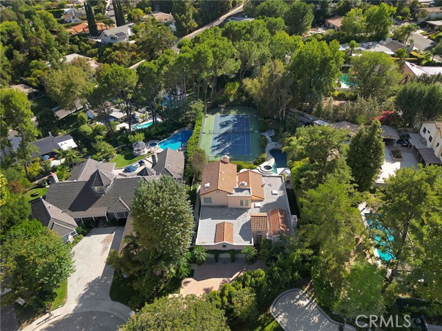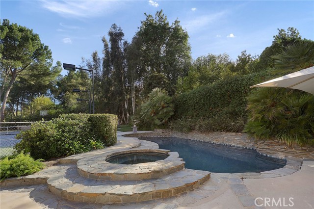 Located on a private, gated street, this architectural home offers a rare blend of sophistication, comfort, and resort-style living. Far from the typical home, it’s designed to inspire—balancing striking design with a warm, livable flow ideal for an active way of living and effortless entertaining. Step through the grand foyer into a beautifully appointed interior where natural light, soaring ceilings, and dramatic architectural elements create an atmosphere of elegance and ease. The chef’s kitchen opens seamlessly to the expansive living and dining areas, perfect for gatherings both large and intimate. The first level features two generous bedrooms sharing a Jack-and-Jill bath, plus an additional ensuite bedroom and a convenient laundry room. Upstairs, the spectacular primary retreat feels like a private sanctuary—complete with a loft, romantic fireplace, private balcony, and great natural light. The sumptuous bath features dual vanities, a spa tub, separate shower, and a spacious walk-in closet. Additional highlights include a 3-car garage with direct access, a modern home security system, and an adaptable floor plan that can be easily customized to suit any taste or design aesthetic. Outdoors, the home truly shines—a private backyard oasis surrounded by mature trees and lush greenery. Enjoy a tranquil pool and spa, BBQ center, and patio designed for entertaining or relaxing. The PRIVATE TENNIS COURT is easily converted to a PICKLEBALL COURT, or the space could be reimagined as a guest house, music studio, or other creative retreat, offering endless possibilities on this large, beautiful lot. This house is a vibe—architectural, private, and truly a rare find.