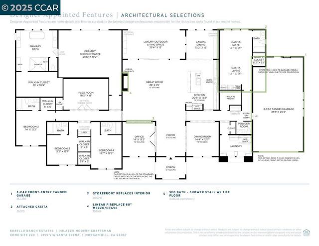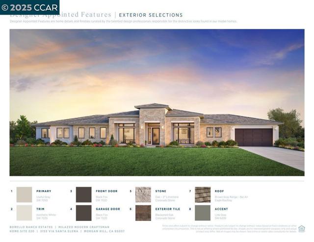 Set in a secluded location surrounded by Morgan Hill's soft rolling hills and open space, Borello Ranch Estates is a luxury gated community. Lovely enclave location close walk to clubhouse. Multi-generational casita with kitchenette and private door to exterior. Ample office and elegant formal dining room, with views to the great room and large luxury outdoor living space beyond, with expansive slope behind for viewing nature and spacious side yard. The kitchen is enhanced by a large center island, breakfast bar, upgraded JennAir stainless steel appliances, including 24" beverage center, an oversized walk-in pantry, and a passthrough to the dining room. Primary bedroom suite is an expansive walk-in closet and a luxurious primary bath with dual vanities, large soaking tub, luxe shower with seat, and linen storage. Secondary bedrooms feature walk-in closets and private baths and are central to a sizable flex room. Resort-style recreation center featuring over 7,000 sq.ft of indoor/outdoor space. pool, spa, bbq facilities, bocce ball and pickleball courts, and many other amenities. Located close to 101 and Caltrain (Photos not of actual home, features and upgrades are different)