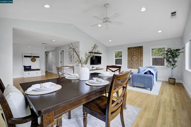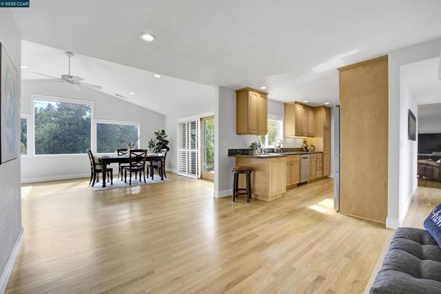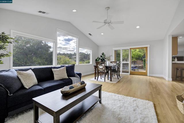 Tucked away in one of Walnut Creek’s most sought-after neighborhoods on a friendly and inviting street, this single-level ranch charmer blends modern comfort with timeless style. Just steps from the local trail system, Larkey Park, and only five minutes from downtown Walnut Creek, this home offers a rare combination of privacy, convenience, plus unobstructed views of Mt. Diablo and rolling green hillsides. The inviting floor plan features a spacious family room with vaulted ceilings, dramatic picture windows, and abundant natural light that captures the incredible scenery. The extra-wide galley kitchen includes a gas range, breakfast bar, and connects seamlessly to the bonus flex room ideal for an office, den, or formal dining space, complete with a pass-through window for added convenience. Enjoy LED lighting & hardwood flooring throughout, durable, stylish, and easy to maintain. Both bathrooms are modernized with fresh, updated finishes, and all three bedrooms offer great light and comfort. Set on a large, private lot with low-maintenance landscaping, this home invites you to relax outdoors to soak in the serene views. Additional highlights include a new energy-efficient roof (2023) and thoughtful updates throughout. Don’t miss this darling Palos Verdes gem — priced to sell!