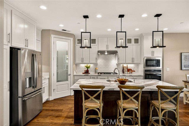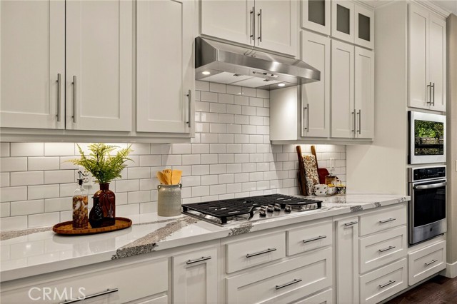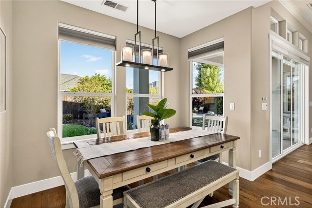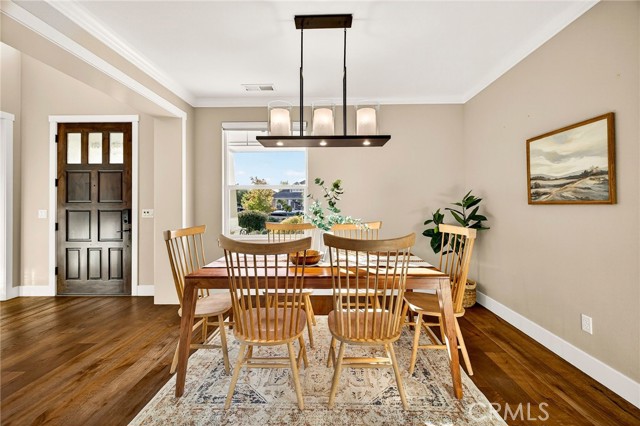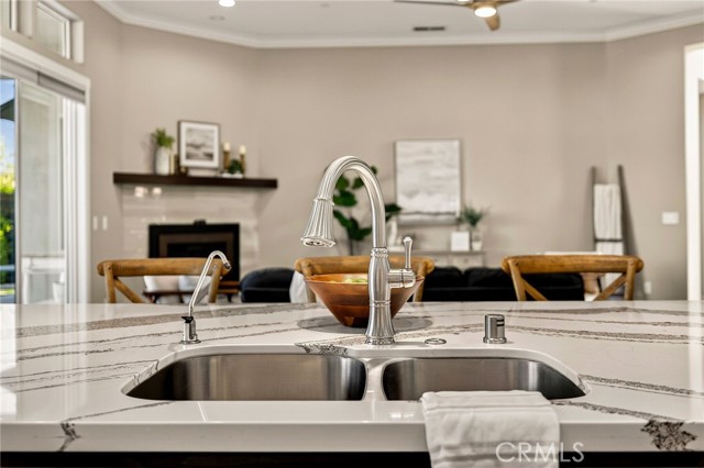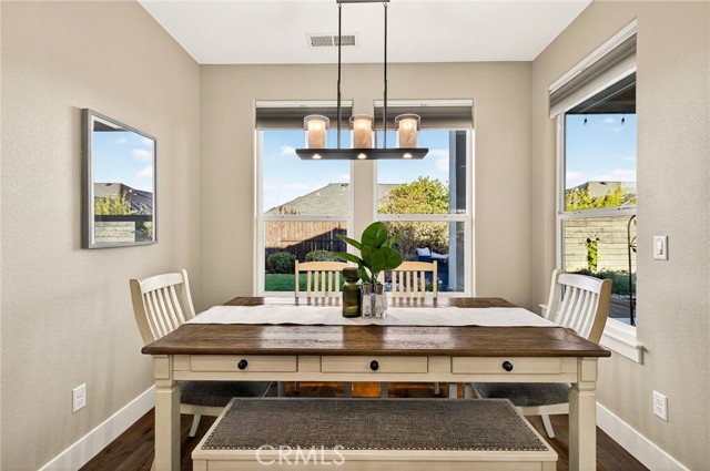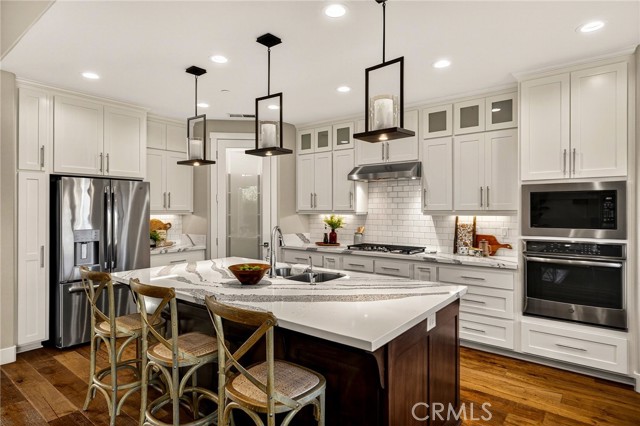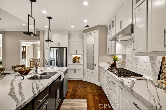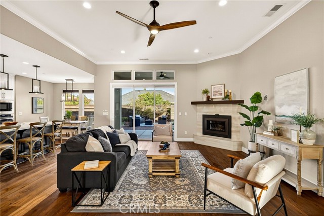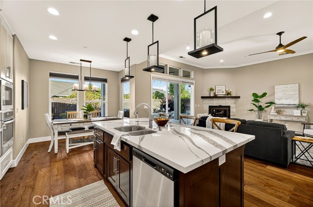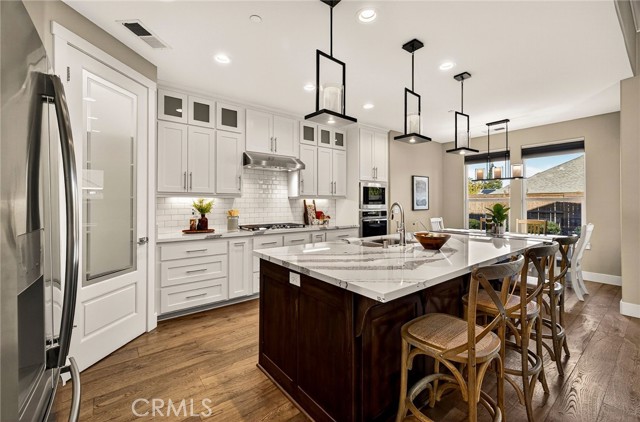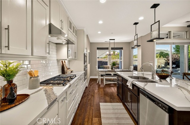 Step through the grand 14' ceiling entryway and into the expansive open-concept great room, where natural light pours through large windows and a 12' sliding glass door leading to a covered patio—perfect for indoor-outdoor living and entertaining. The chef's kitchen is a dream with upgraded quartz countertops, full tile backsplash, high-end GE stainless steel appliances, pull out storage, walk in pantry and a cozy dining nook in addition to a formal dining room for elegant gatherings.