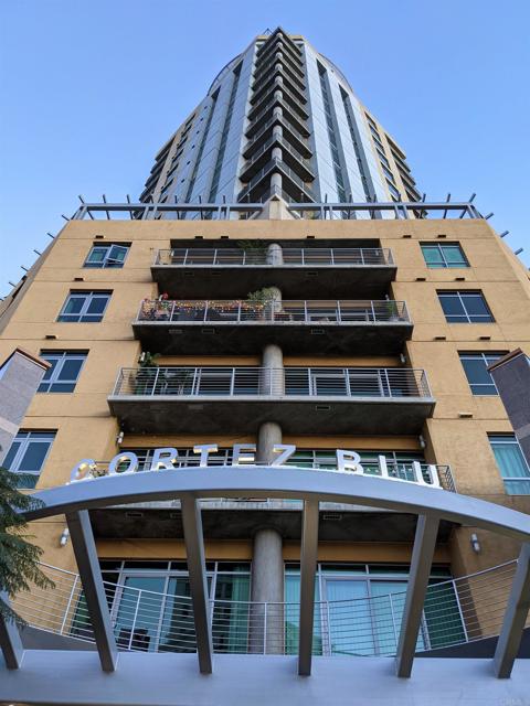 Something very special! Beautiful bright condo "Cortez Blu" offers unique layout at only a few units per floor. This "hard to find" over-sized 1BR/1.5BA boasts a huge private balcony with city views, bonus half-bath, long tiled hallway, contemporary cement ceilings, big walk-in closet, floor to ceiling windows providing plenty of natural light, & TWO(2) storage units @ underground parking area! Kitchen comes with stainless appliances, granite surfaces, and under cabinet lighting. Cortez Blu is ideally located atop Cortez Hill with easy access to freeways(5 & 163), Balboa Park, the Gaslamp Quarter, Little Italy, and Petco Park! NO ONE BELOW!!