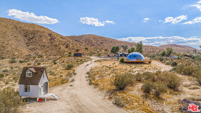 NEW IMPROVED PRICE!! Two separate units plus a dome. Main house, converted garage into a studio and dome. Nestled on eight acres of serene, open land, this extraordinary property offers breathtaking panoramic views and unmatched privacy. It's a rare investment opportunity for a short-term rental or the perfect sanctuary for those seeking a vacation retreat. The main home boasts an open-concept design, featuring sleek, refinished concrete floors, a custom front door, and contemporary lighting fixtures. The kitchen is a showpiece, with chic cabinetry and stunning terrazzo countertops from Concrete Collaborative. A newly renovated two-car garage has been transformed into a refined studio apartment, complete with elegant hardwood floors, a fully equipped kitchen, and a modern bath. Adding to the property's unique allure is a striking glass dome, offering endless possibilities. Imagine it as a stylish living space, a vibrant entertainment hub, a peaceful stargazing lounge, or even additional rental accommodations. The outdoor space is equally captivating, featuring a private trailhead, a cozy fire pit, and a dining area surrounded by lush, mature succulents and trees. Expansive windows frame the property's awe-inspiring views and a distinctive outdoor mural, effortlessly blending indoor comfort with outdoor beauty. Additional highlights include a 250-foot water well with a 2,500-gallon tank and a 150-foot booster pump, ensuring efficient water flow. Ideally located just 20 minutes from Palm Springs, Joshua Tree, Pappy & Harriet's, and Pioneer Town, this property offers the perfect balance of seclusion and accessibility. Whether you're envisioning a vacation rental, an event space, or a peaceful retreat, 51889 Canyon is primed to make your vision a reality. 4 Bedrooms and 3 Baths. Garage was converted without permits and it's included in the bed and bath and estimated square footage count. Disclaimer: Broker and agents do not represent or guarantee the accuracy of the square footage, income, expenses, condition, development potential, bedroom/bathroom count, lot size or lot lines, dimensions, permitted or non- permitted spaces, or school eligibility. Buyer is advised to independently verify the accuracy of all information with appropriate professionals. There are no warranties or guarantees, buyer to rely solely on his/her/their own findings.