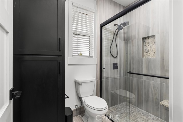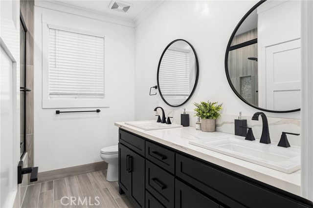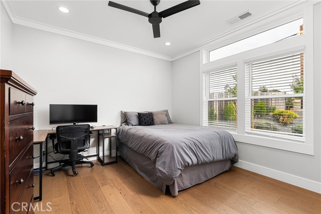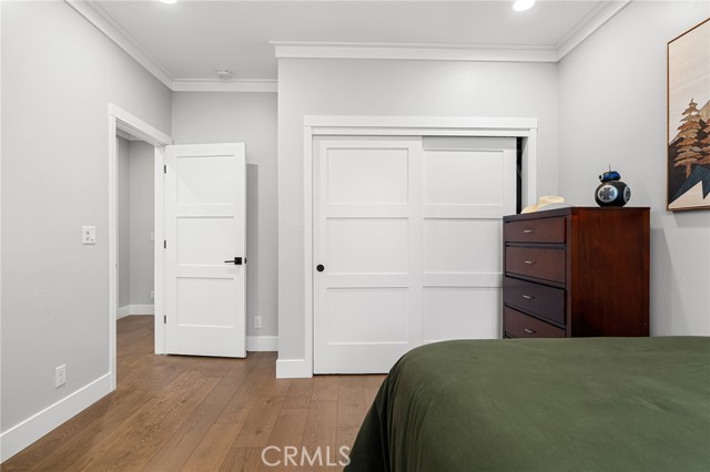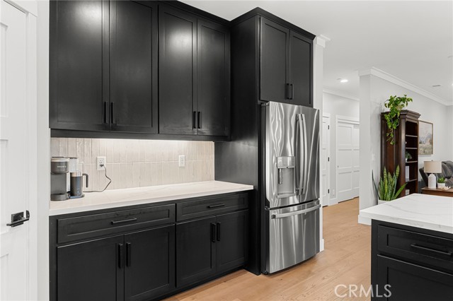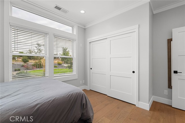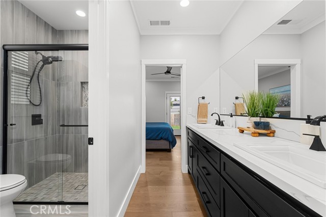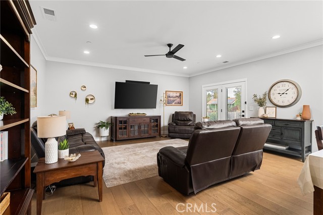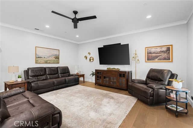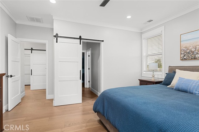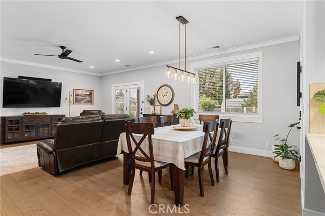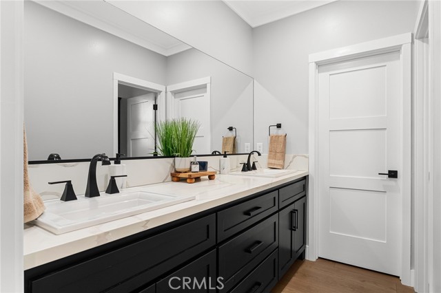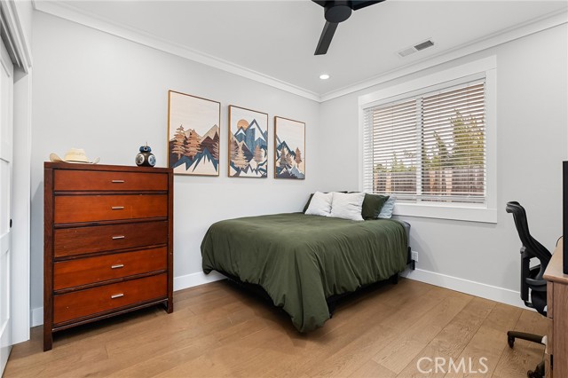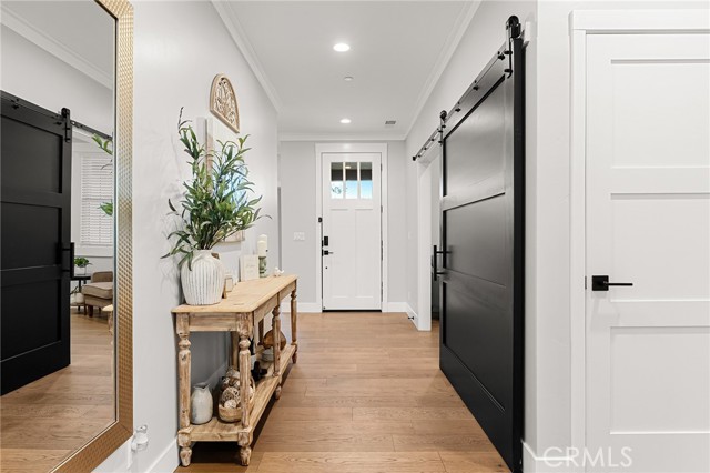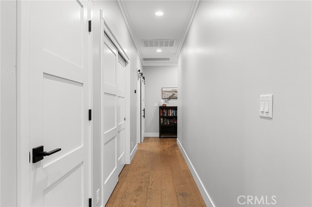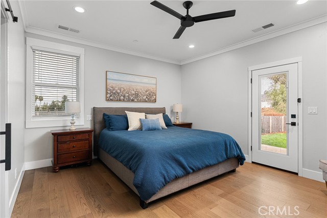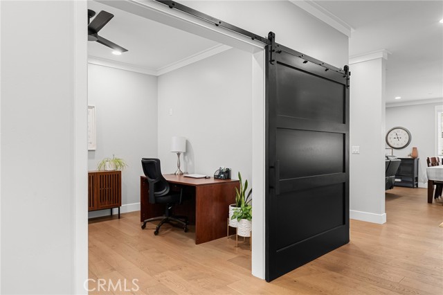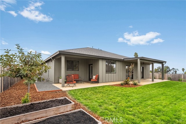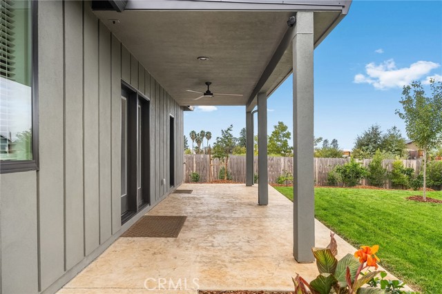 The open-concept great room is ideal for everyday living and entertaining, featuring a bright, airy layout that connects seamlessly to the kitchen and dining area. The kitchen includes shaker-style cabinetry, quartz counters, a deep sink, under-cabinet lighting, a pantry, and stainless steel appliances. The dining area opens to the backyard through two sets of doors, filling the home with natural light. The primary suite provides a relaxing retreat with dual vanities and a large walk-in shower. Two additional bedrooms and a full bath are located off the main hall, along with a versatile den that could easily serve as a home office, 4th bedroom, or reading nook. Upgrades include crown molding, ceiling fans, a whole house fan, and three stylish barn doors that add both character and functionality. Enjoy the benefits of 28 owned solar panels, which the sellers say provide significant energy savings—and even money back each month. The exterior is just as impressive, featuring two covered back patios, a charming covered front porch, and fresh landscaping with lemon, 2 orange, apricot, plum, and nectarine trees. A seasonal creek runs along the back of the property, adding a peaceful touch. There’s ample RV parking and a fully fenced yard, perfect for relaxing outdoors. Property extends to the second fence. Come see this beautifully designed home and imagine the possibilities, it’s the perfect blend of quality, efficiency, and warmth.