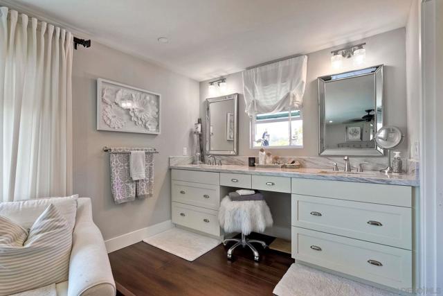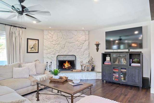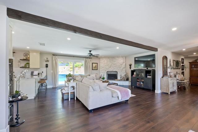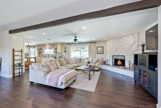 A stunning freshly renovated single level estate set in desirable southwest Escondido, thoughtfully updated with panoramic views. Set in highly desirable southwest Escondido. This gorgeous home is well appointed starting with the interior open floorplan adorned in tasteful high quality engineered wood flooring, new custom light led fixtures and pendant lighting, a new gourmet kitchen fit for an executive chef, desirable Thermador appliances including a built in refrigerator, dual ovens, induction cooktop, custom finished hood/vent, microwave drawer, and custom cabinetry with soft close and dovetail drawers. Featuring 4 bedrooms, the primary suite hosts a new glamorous bathroom with new dual vanity, sitting make up quartz counter, with custom shower enclosure. The secondary bedrooms feature generous room sizes, a secondary bathroom features custom tile flooring, new counters, sinks and light fixtures. A very convenient half bath with custom closet organizers serves the interior guest and outdoor entertaining space. The backyard space with a newly constructed pool and spa, with new decking, a pool house/ADU/casita provide additional changing and retreat space. Fruit and Citrus trees throughout, a freshly paved circular driveway with room for RV parking and guest parking, a newly installed septic system, upgraded electrical panel and solar system. Set on a .69 acre lot, there is no HOA or Mello Roos. A family compound. For those seeking privacy and a family compound. Fresh exterior paint. Home Upgrades 1. All Newer Electric 2. Newer Roof 3. Upgraded insulation in the attic for prevention of rodents 4. Newer traffic rated commercial grade septic system 5. Newer custom-built kitchen and bathroom cabinets 6. Upgraded appliances (Thermador) 7. Custom hood vent 8. All newer walls 9. Paint on interior and exterior 10. Removed family room wall 11. All newer flooring 12. All newer lighting 13. Ceiling fans throughout 14. Custom California closets in all rooms and hallway closet 15. Recently had dryer vents and chimney inspected (Annual inspection) 16. Pool and Spa 17. Concrete in backyard 18. Garage drywall 19. Landscaping 20. Unpermitted ADU 21. All newer asphalt, circular driveways and down the shared street. 22. Custom countertops 23. Upgraded electrical panel (Approved by SDG&E) 24. Raised living room floors 25. Newer bathroom showers, toilets 26. Newer Sliders, French doors, doors, knobs and installation 27. Front door 28. New Solar System 29. Alarm System with Front Yard Camera 30. Replacement of 3 windows and an additional window in master bath 31. Christmas light outlets at roofline Room for RV, Boat, 5th wheel. Family Compound