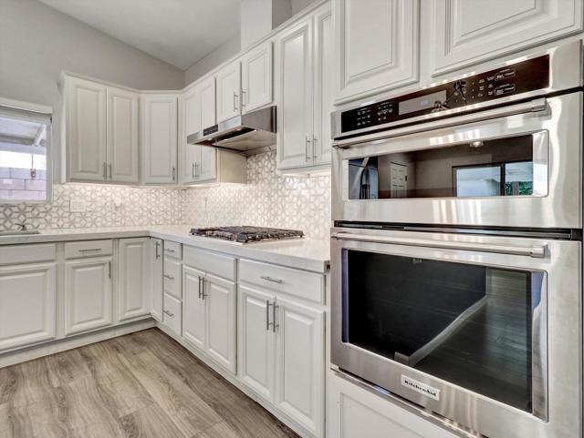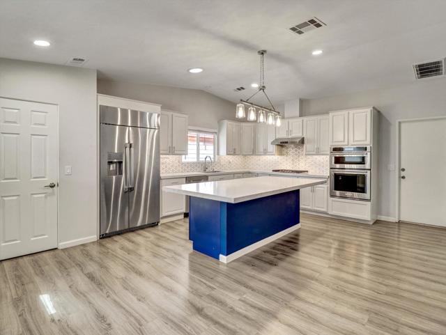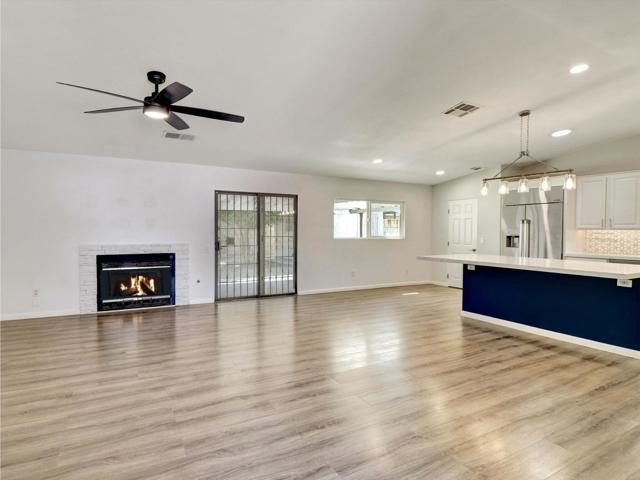 No Mello-Roos! If you're looking for a beautifully renovated home with a show-stopping kitchen, don't miss this opportunity! As soon as you walk in, you will be greeted with an abundance of natural light. For those cold, desert nights the spacious living room offers an elegant fireplace to keep you warm. The open floor plan makes it easy to access the fully upgraded kitchen, which boasts modern, stainless steel appliances, a kitchen island, marble backsplash, and sleek quartz countertops. The stylish flooring is the same throughout the home, which creates a sense of space and luxury. The primary bedroom has its own en suite. There is also an additional full bathroom in the hallway to accommodate the other two bedrooms or guests when entertaining.Enclosing a property can be a great expense. Fortunately, the entire property is already fenced and block-walled for you. With the back yard already level and the privacy from the block walls, you can easily create your very own desert oasis; perhaps even add a pool! With the fireplace-equipped living room and open kitchen having direct access to the front and back yards, indoor/outdoor entertaining is a dream. Whether you're hosting a family celebration or enjoying a relaxing evening to yourself, this home is sure to set the stage for many wonderful memories to come!