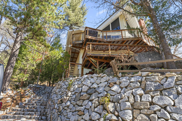 Located among lush trees in the highly sought-after West Shore of Lake Arrowhead, this beautifully upgraded 1st-tier prow-style retreat offers the perfect blend of peace, style, and convenience. With the ALA trail access directly across the street, you can easily enjoy the lake and access the shoreline walk to Tavern Bay Beach Club, near the picturesque UCLA Conference Center. Step inside and be greeted by soaring ceilings, a striking floor-to-ceiling stone fireplace, and a dramatic wall of glass that floods the space with natural light. The spacious open-concept main level features a large kitchen flowing right into the dining and living areas--perfect for entertaining. Downstairs, a versatile family/game room awaits, complete with a built-in wet bar, fireplace, and separate laundry room and utility/storage area. With 3 bedrooms, 2 full baths, and 2 half baths, this home has room for everyone. Enjoy the outdoors on the large Trex deck and take in the forest views and a peek of the lake across the street. The property extends well beyond the back of the house, offering plenty of space to create a generous fenced yard, garden, or play area--ideal for pets or simply relaxing in your own private outdoor retreat. Additional features include: dual pane windows, newer carpet & fresh paint throughout; low-maintenance vinyl siding; plenty of storage & off-street parking; newer quartz countertops; upgraded sinks and shower; and newer fixtures. No matter what you are looking for, this exceptional Lake Arrowhead retreat is ready for you! Don't miss this opportunity--schedule your showing today!