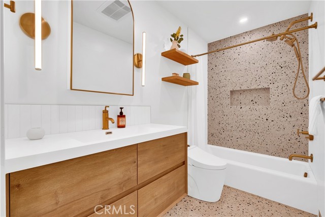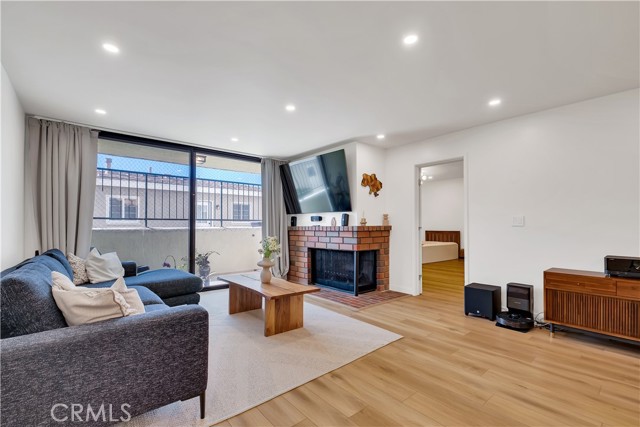 Step inside to discover a thoughtfully upgraded interior designed for both comfort and convenience. The modern galley kitchen features sleek finishes, wonderfully appointed stainless steel appliances. The kitchen flows seamlessly into the open-concept dining and living areas. A gorgeous fireplace anchors the living space, while sliding doors lead out to a private balcony—perfect for enjoying the SoCal sunshine.