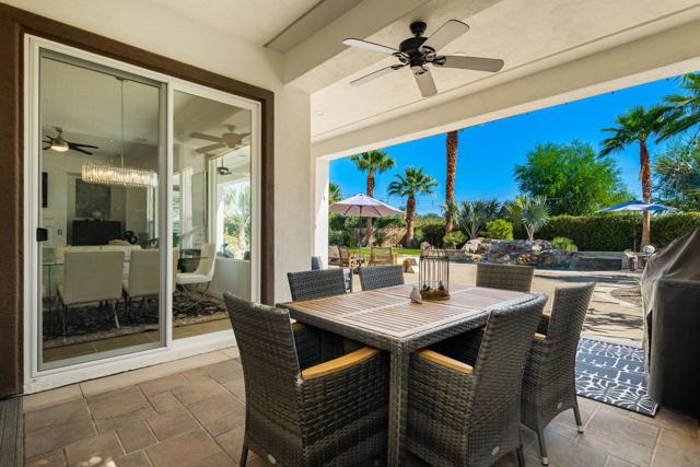 Exquisitely furnished Monarch plan with 10' ceilings situated on a spacious 12,623 sq. ft. lot within the resort-style 55+ community of Trilogy La Quinta. This single-level residence offers ample square footage of refined interior living space, featuring 3 bedrooms and 2 bathrooms. The home welcomes guests with an extended driveway, wrought-iron entry gate, and an elegant front courtyard enhanced with pavers to enjoy the 180-degree mountain sunset views, an expanded entry area, and ambient landscape lighting. The great room impresses with a granite-encased fireplace, designer chandeliers in the entry and dining areas, an entertainment niche, surround sound, crown molding, arched doorways, and custom window coverings. Additional upgrades include LED recessed lighting throughout and upgraded ceiling fans and light fixtures. The dining area flows seamlessly into the chef's kitchen, beautifully appointed with quartz countertops, a glass tile backsplash, breakfast bar, reverse osmosis drinking water system, upgraded KitchenAid stainless steel appliances, built-in double ovens, microwave, refrigerator, waterfall-edge prep island, 5-burner gas cooktop, pantry, and abundant cabinetry with brushed nickel hardware. The generous primary suite offers a bay window with plantation shutters, high-grade tile flooring, French door access to the backyard, newer countertops, sinks, faucets, and valves, dual vanities, a walk-in closet, and a large floor-to-ceiling tiled shower with glass enclosure. Guest accommodations are conveniently located near a full bath featuring quartz counters and a tile-enclosed tub/shower combination. The resort-style backyard is an entertainer's dream, showcasing a free-form Pebble-Tec pool, cascading spa, dramatic rock waterfall, paver decking, misting system, covered patio, fire pit, backyard up-lighting, and lush professional landscaping--all enhanced by a Pentair pool control system with Wi-Fi capability. Additional highlights include fresh interior and exterior paint, and a finished two-car garage featuring a 25,000 BTU mini-split A/C unit, insulated Wi-Fi-enabled garage door, upgraded motor and track system, premium roof-mounted storage, and an extended four-foot bay. This stunning property offers the epitome of luxury desert resort living--schedule your private showing today.