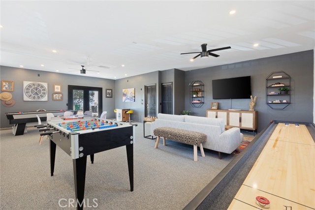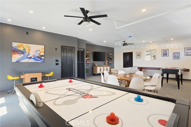 A fully converted game room with mini split, arcade games, and shuffleboard