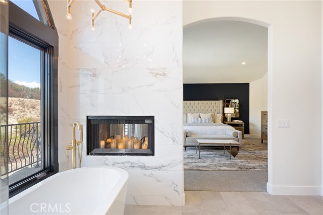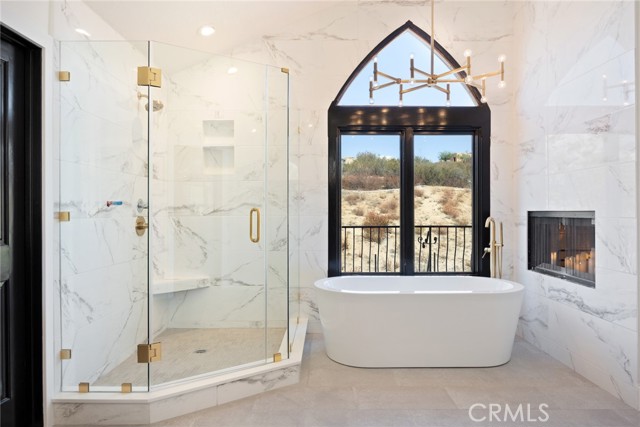 Designer lighting and an electric fireplace.