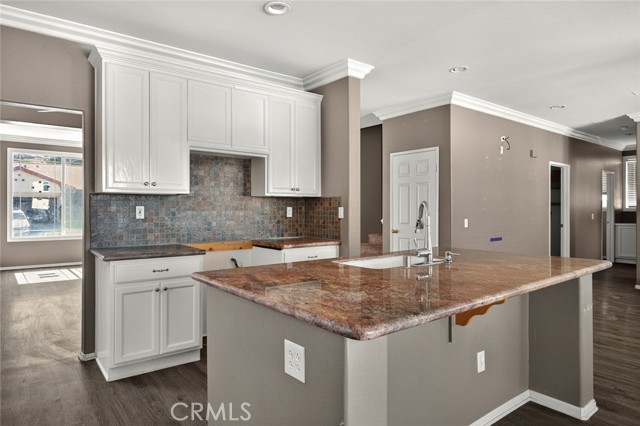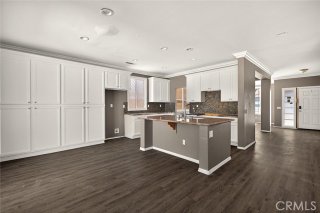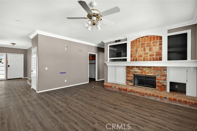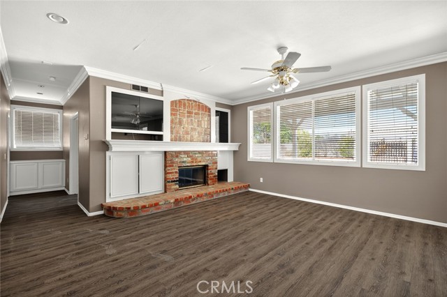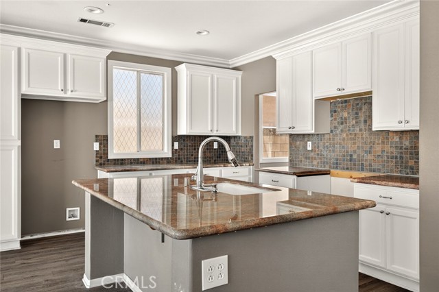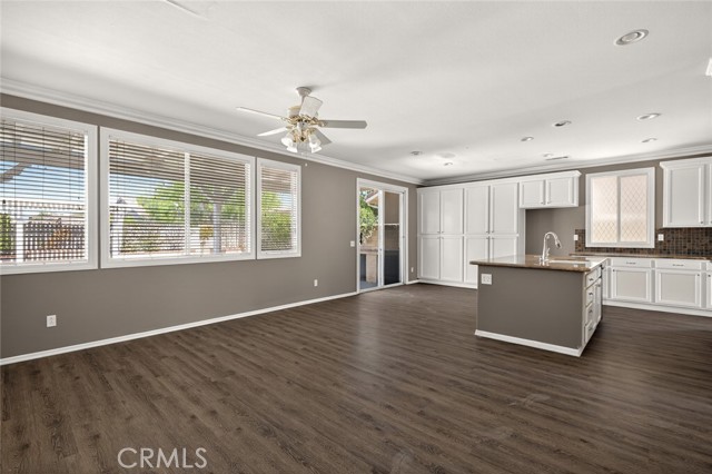 Step inside to find elegant vinyl flooring, crown molding, ceiling fans and recessed lighting throughout. The kitchen is a chef’s dream—featuring granite countertops, a deep single-basin sink, a center island with bar stool seating, and abundant storage. The open-concept layout flows into a spacious family room with custom built-ins and a brick dual-sided fireplace—perfect for cozy evenings.