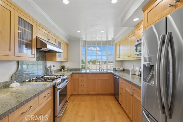 Modern Sherman Oaks Condo with Stunning Valley Views. Welcome to this beautifully updated 2-bedroom, 2-bath condo in the heart of Sherman Oaks, offering picturesque views over tree-lined streets and stretching all the way across the Valley to the Santa Susana Mountains. With an open-concept layout and sunlight pouring into every room, this home perfectly blends comfort, style, and convenience. The remodeled kitchen is a standout, featuring custom cabinetry, granite countertops and backsplash, built-in seating, stainless steel appliances, a gas range, and refrigerator. Hardwood floors run throughout the unit, accented by recessed lighting, plantation shutters, and charming bay windows. The spacious living room boasts a cozy marble fireplace, perfect for relaxing evenings. The primary suite offers a walk-in closet and a remodeled en-suite bathroom with a custom dual-sink vanity, granite countertop, and a fully tiled shower. The secondary bedroom features a large closet and easy access to another stylishly upgraded full bath. Additional highlights include central air and heat, two reserved spaces in the gated underground garage already wired for EV charging in your own space. Community amenities include a pool, spa, and fitness room. All of this is just a block from Ventura Boulevard's best dining, shopping, and entertainment, including Bacari, Schatzi’s, The Local Peasant, Mendocino Farms, and Ralphs. Quick access to the 101 and 405 freeways and top-rated schools like The Buckley School make this a rare find in one of the Valley's most desirable neighborhoods.