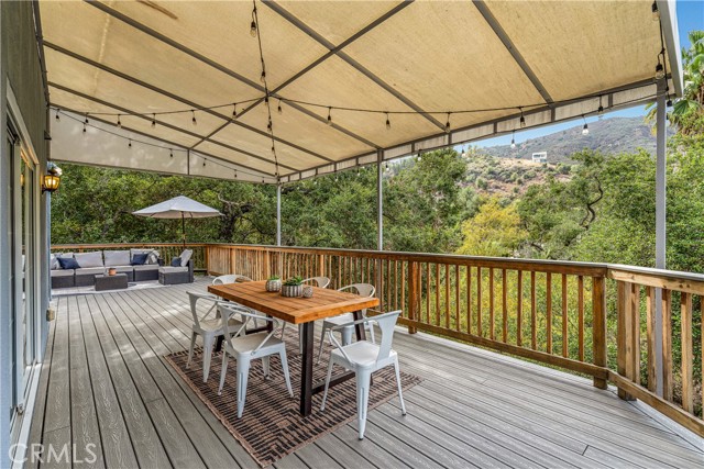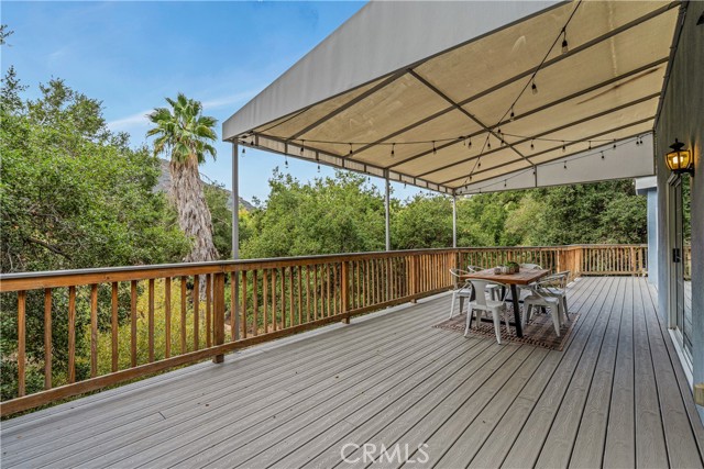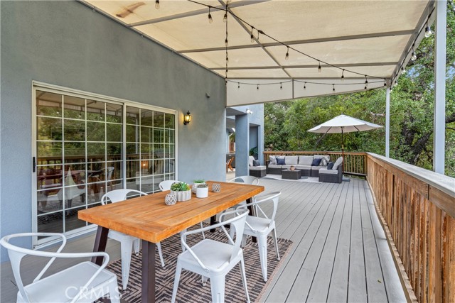 The adjoining family room, complete with a decorative stone fireplace, opens to the deck — perfect for indoor/outdoor entertaining. The deck spans the length of the home and offers multiple covered sitting areas, sparkling string lights, and a relaxing hot tub — ideal for entertaining or quiet evenings surrounded by nature. There’s also plenty of space to expand these outdoor areas if desired.