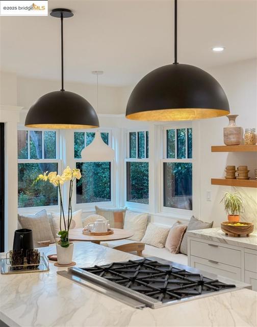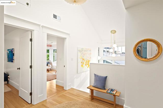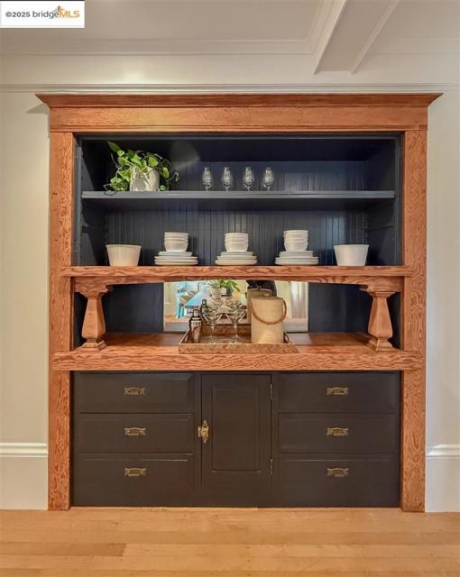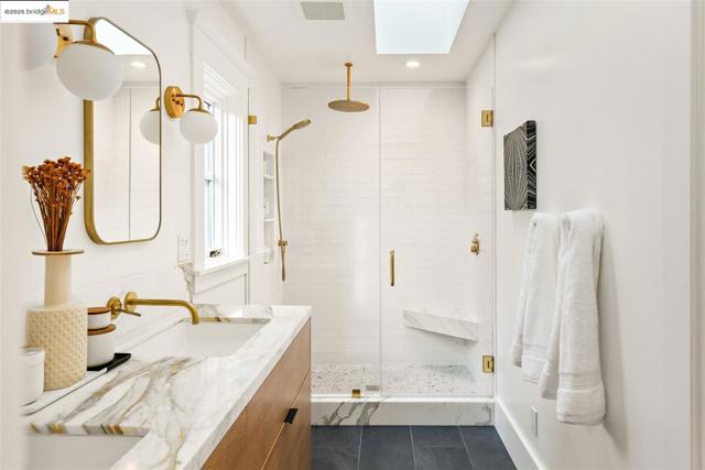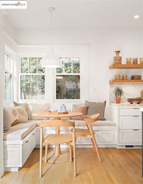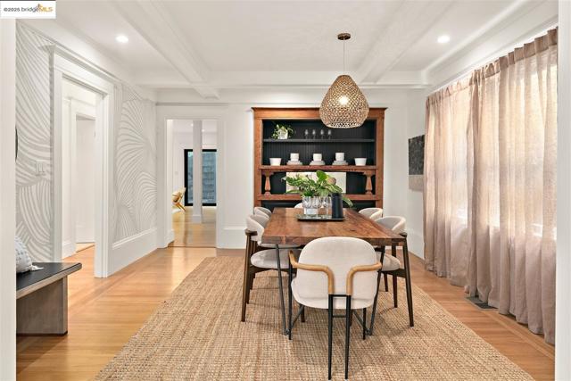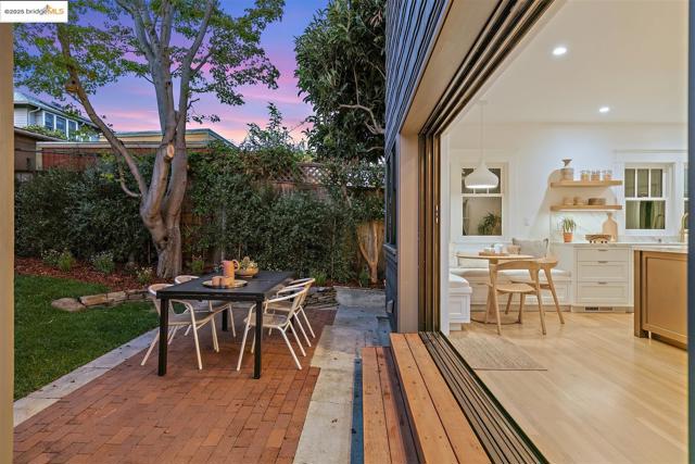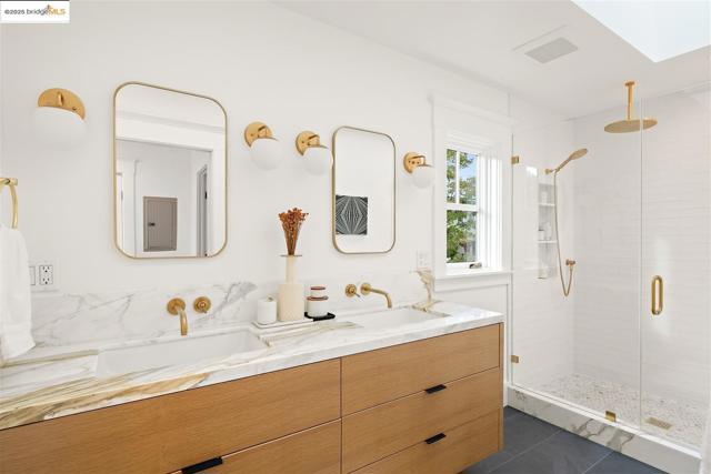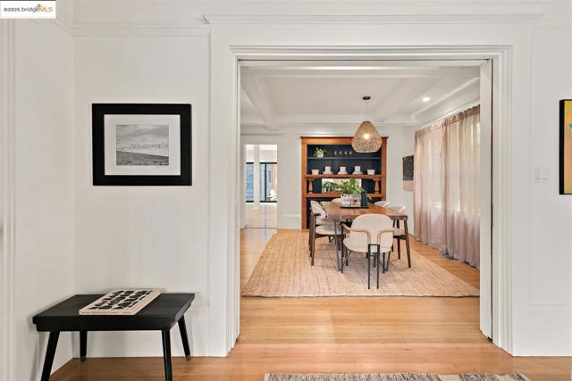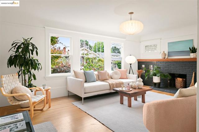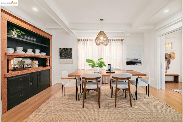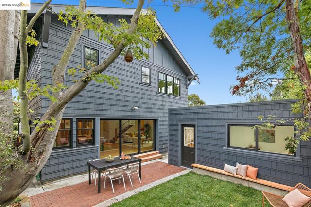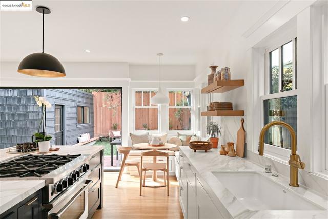 Exquisitely designed while embracing 1912 period details, this 2,672 square feet, 4 bedroom, 3 bathroom Rockridge Craftsman combines natural sophistication and modern luxury. Expanded and renovated in 2021, this sound home is part open concept with a great room combining a chef’s kitchen, breakfast nook and family room that all flow into the serene backyard with an indoor/outdoor three panel stacking glass door that disappears into the wall. This shingled Craftsman still retains its original character and soul from the period style detailed trim and high baseboard throughout, to the box beam ceiling in the formal dining room, and original built-ins in the formal living room and dining room, along with four stained glass windows. Elegance abounds with high end, custom materials, from a 6 burner Blue Star range, to Miele dishwasher, to Grohe plumbing fixtures, to Calacatta marble, to handmade cabinets, to handmade wrought iron railing to designer lights throughout. Mostly newer foundation and electrical, and newer plumbing, roof, heating. Mostly Marvin Signature double pane windows and 5 skylights flood this home with natural light. Backyard patio and lawn, two highly productive raised vegetable beds, a 358 sq ft semi finished bonus space and an extra long driveway.