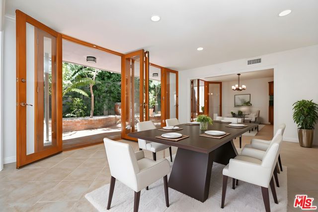 This SFR is located in a 5 unit development. Welcome to 14128 Dickens Street in Sherman Oaks, CA a rare townhouse-style single family residence tucked away in the picturesque Stansbury Estates. Part of an intimate, well-maintained complex of just five homes, this is truly the crown jewel: a private retreat that lives like a single-family home, moments from Whole Foods, top restaurants, and upscale shopping. Step inside to an impressive foyer featuring a charming tile mosaic, soaring ceilings with chandelier and shiplap detail, and a convenient coat closet. From here, the eye is drawn through the expansive living space to French doors framing the lush greenery of your private backyard. The open-concept living and dining areas flow effortlessly together, creating an inviting atmosphere ideal for everyday living or entertaining. Walls of French doors flood the space with natural light and open to a tranquil garden patio, delivering that coveted indoor-outdoor California lifestyle. The kitchen is a chef's dream with a central island, abundant counter space, extensive cabinetry, elegant stainless steel appliances, and direct access to the two-car garage. Completing the main level is a cozy den or media room with a built-in aquarium and French doors to the patio, plus a spacious downstairs suite perfect as a home office or future primary bedroom complete with its own three-quarter bath. Upstairs, two generous bedroom suites each feature their own bath. The luxurious primary retreat includes serene green views, a spa-like bathroom with quartz finishes, frameless glass shower, soaking tub, dual vanity, and a massive walk-in closet with wood floors and hidden attic storage. Outdoors, the private patio is enclosed by tall Podocarpus trees, offering a peaceful setting for morning coffee, along with a charming planter for the avid gardener. 14128 Dickens is a rare gem equally suited as a pied--terre or forever home in a prime Sherman Oaks location. Don't miss your chance to experience it.