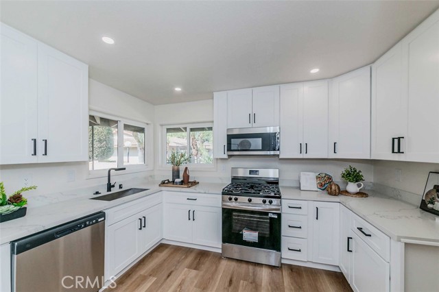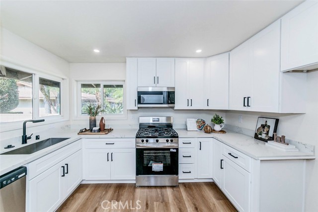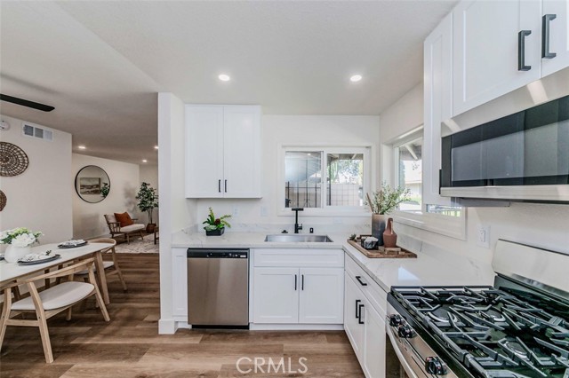 Step into a bright, open-concept layout enhanced with recessed lighting, new laminate wood flooring, and ceiling fan lights in the dining area and each bedroom. The stunning new kitchen showcases Quartz countertops, custom cabinetry, stainless steel appliances, a sleek stainless-steel sink, and a modern faucet—ideal for everyday cooking and entertaining.