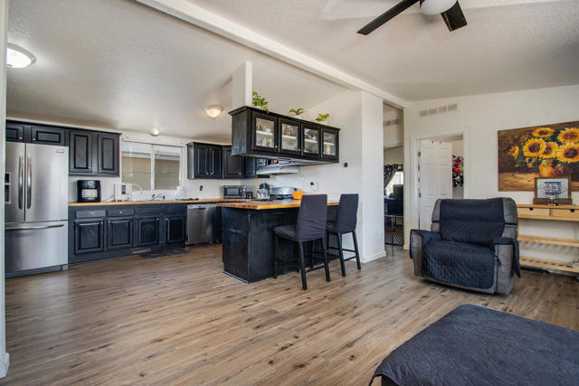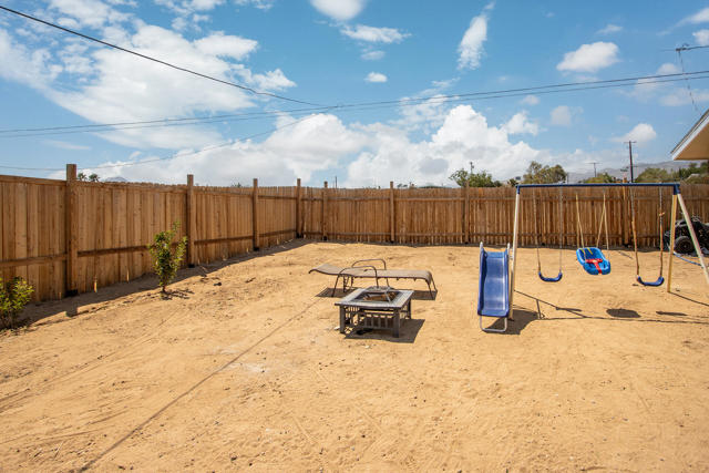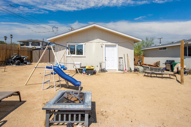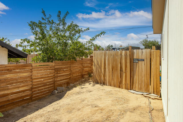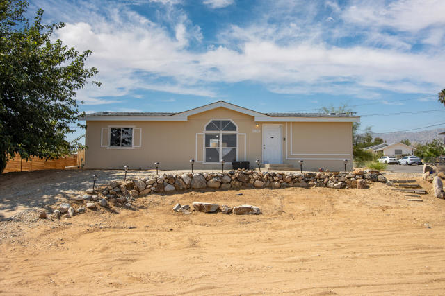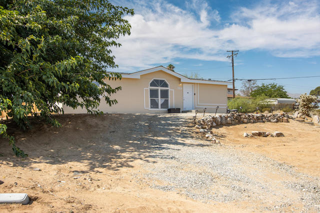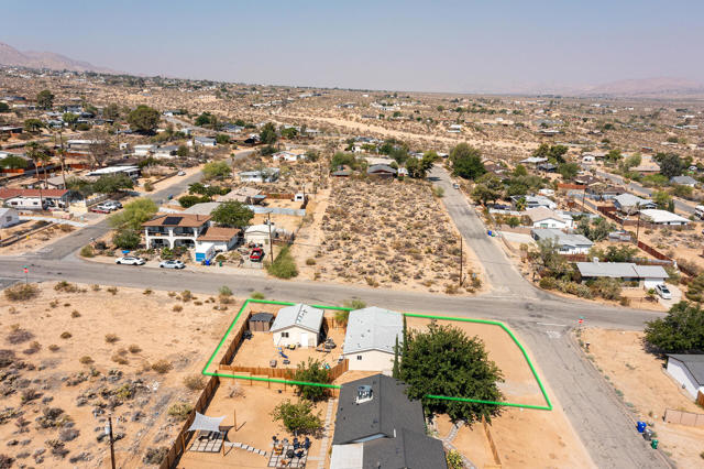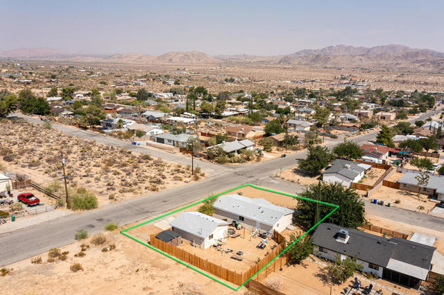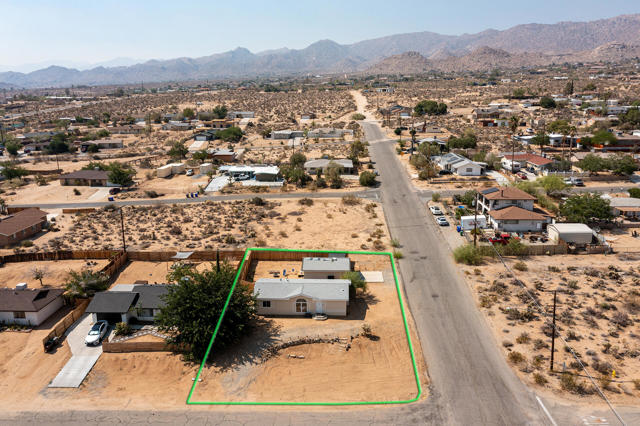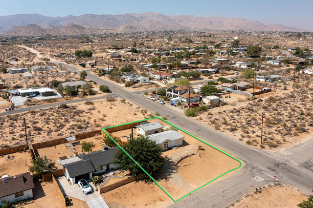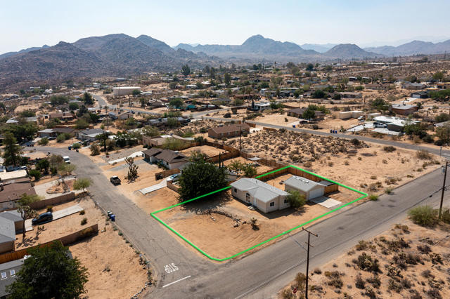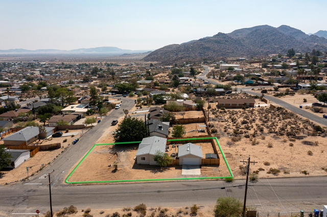 Panoramic views! Beautiful 3 bed 2 bath home in the sought after hillside section of the JT village, plus a large detached garage and fenced backyard on almost a quarter acre corner lot. Front door opens to the living room with vaulted ceilings and over sized bay window. Kitchen features a breakfast bar, stainless steel refrigerator, stove and dishwasher, long counters and ample cupboards. Master bedroom with private bath and walk in closet. Two other large bedrooms are located at the other end of the living room. Enclosed backyard offers privacy and wonderful open sky views. The detached two car garage is conveniently located at directly off the paved road. With this central location you are a short bike ride and drive to organic food, cafes, restaurants, boutiques and some of the nicest outdoor trails in the country. Nearby Sportsman Park offers tennis courts, basketball courts, baseball diamond, playground, dog park and shaded picnic tables. Just under 5 miles to the Joshua Tree National Monument where about 3 million tourists visit annually. 40 miles to Palm Springs. 128 miles to Los Angeles. This would be a wonderful full time residence, investment, and rental. Don't wait on this one - schedule a viewing today! Should have 433a, TBD. Length & Width Approximate.