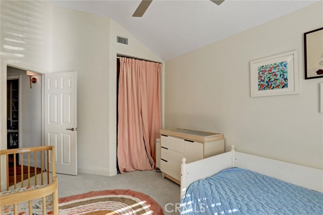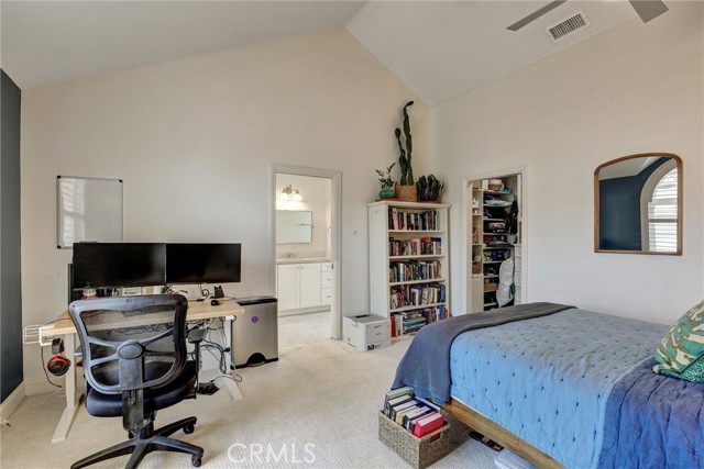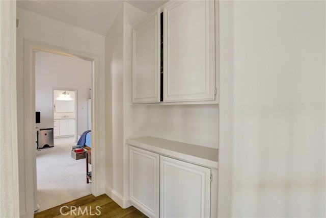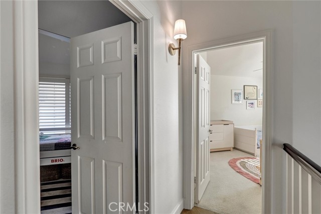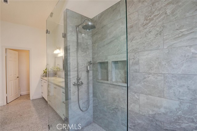 Upstairs, the spacious primary suite features a custom walk-in closet and a luxurious fully remodeled bath with dual vanity, an expansive walk-in shower, and marble tile flooring. Two additional bedrooms with built-in shelving share a beautifully updated full bath.