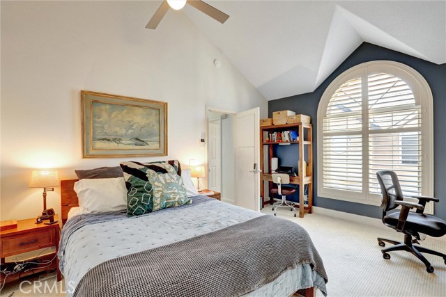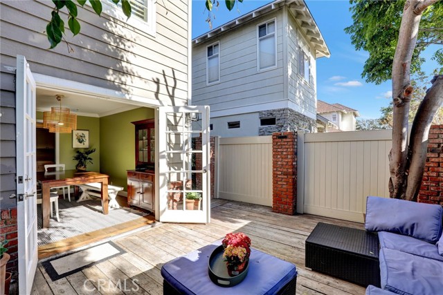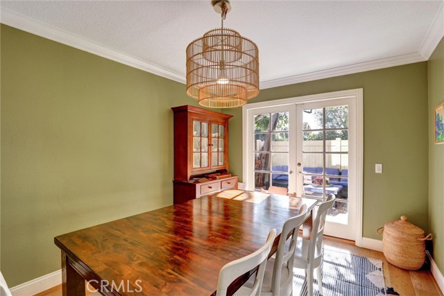 The bright, inviting living room features soaring two-story ceilings, clerestory windows with plantation shutters, wood flooring, and a cozy fireplace. Elegant details include tall baseboards, crown molding, and decorative door casings throughout. French doors from the dining room open to a private patio with deck--perfect for relaxing or entertaining.