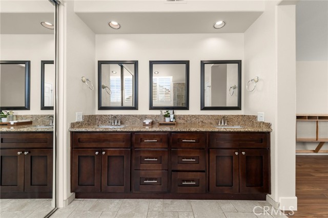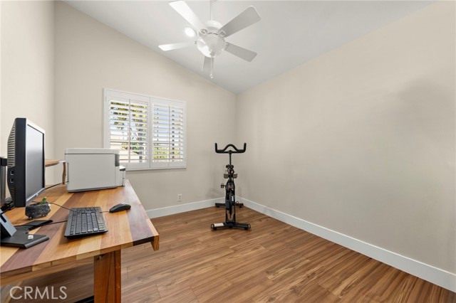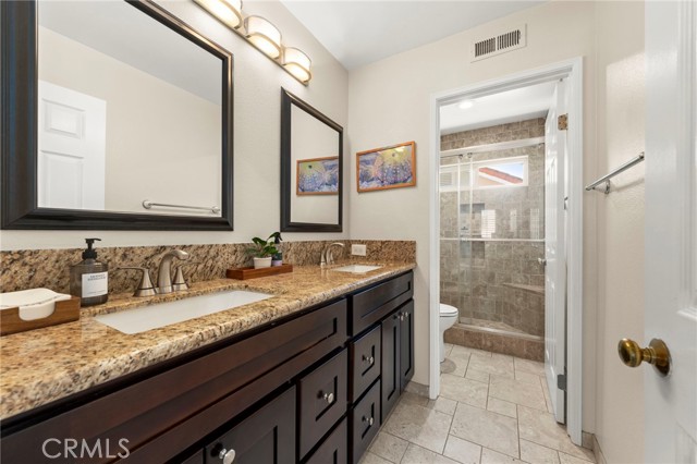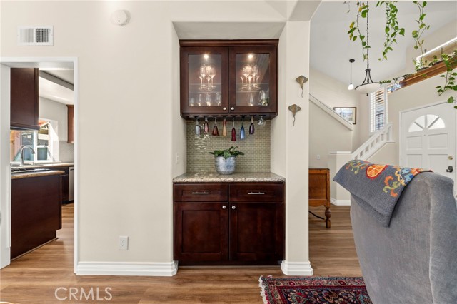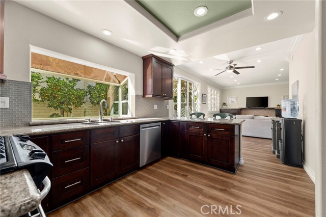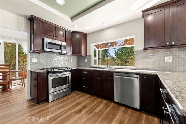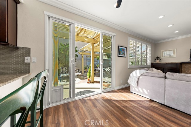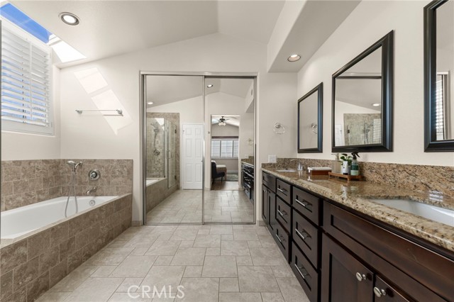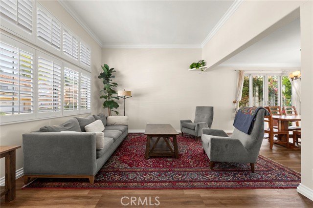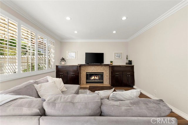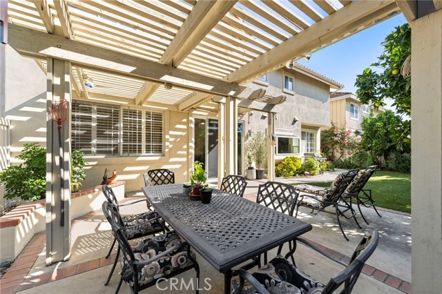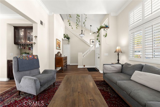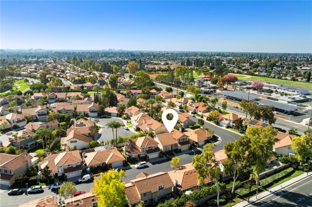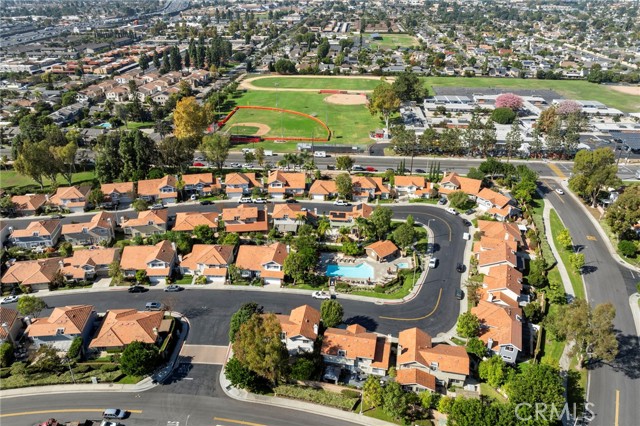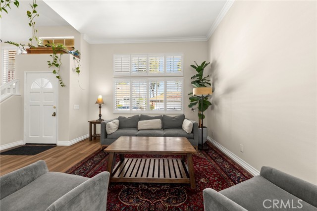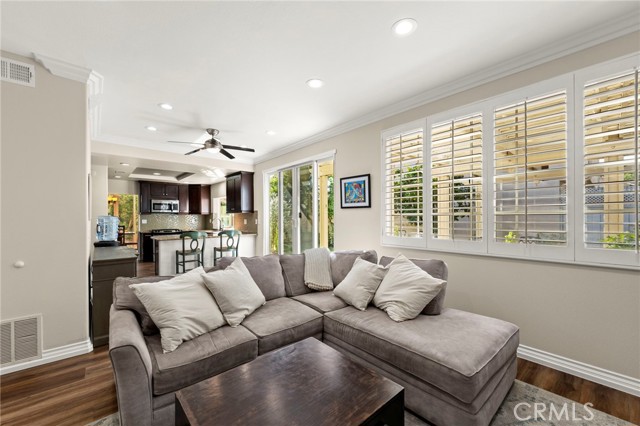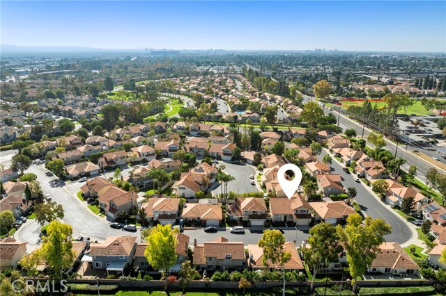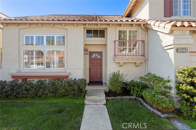 Set in Shadow Brook in the Beckman High School area, this home offers 2,177 sq ft, 4 bedrooms, and 2.5 baths, with freshly painted walls throughout. A dramatic two-story living room flows to a formal dining room. The kitchen features granite countertops, custom wood cabinetry, stainless appliances, a glass-tile backsplash, breakfast bar seating, and a wide picture window to the citrus trees. Sliding glass doors open to a backyard with multiple fruit trees, a concrete patio beneath a pergola, and an artificial-grass lawn. The attached two-car garage includes a dedicated 220V line for EV charging and side/overhead storage. The family room offers a stacked-stone gas fireplace with custom built-ins. Upstairs are four well-sized bedrooms and two full baths, including a vaulted primary suite with a large walk-in closet, dual-sink granite vanity, glass-enclosed walk-in shower, and soaking tub. Additional highlights include plantation shutters, crown molding, recessed lighting, ceiling fans, and an indoor laundry closet with upper cabinets. Shadow Brook provides a low monthly HOA with a pool, spa, and front-lawn maintenance.