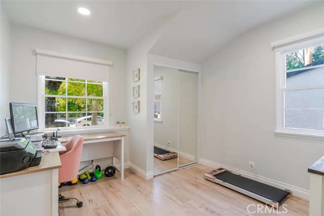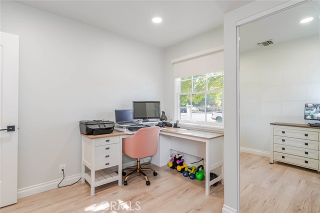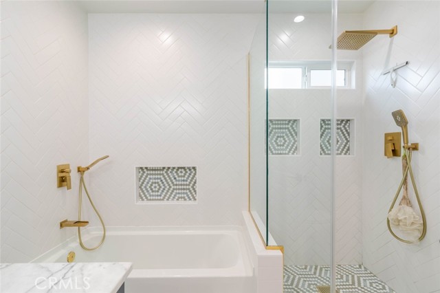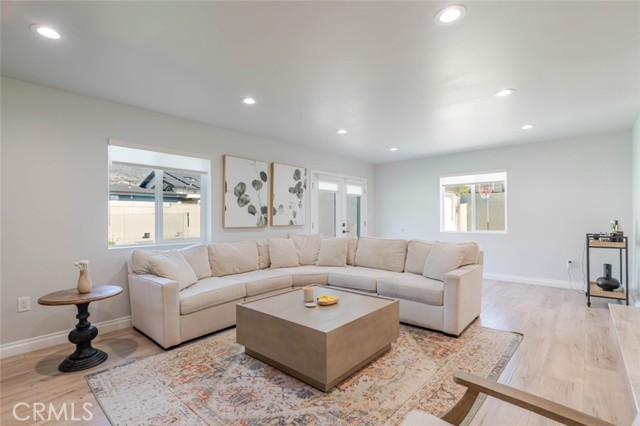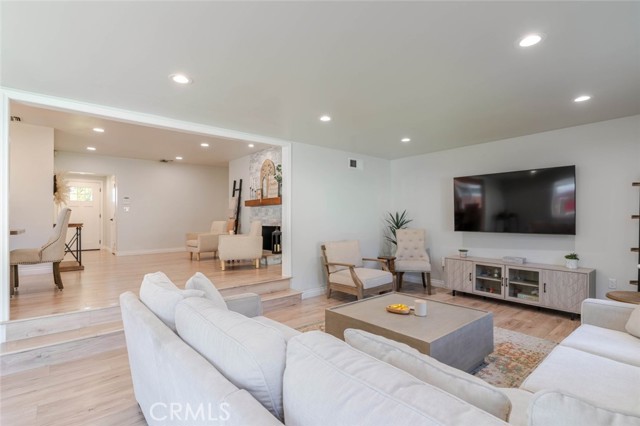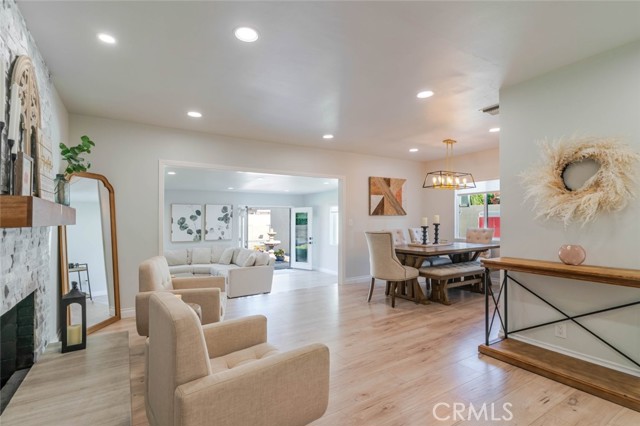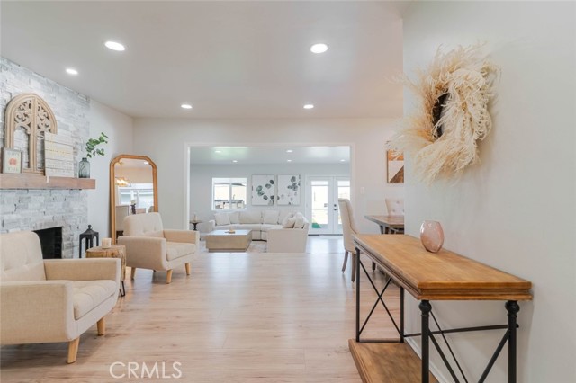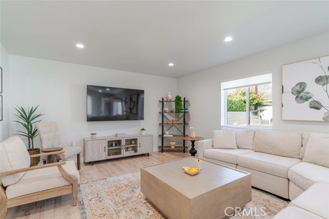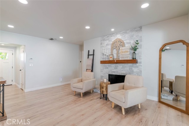 Inside you'll discover a light-filled interior featuring gorgeous light wood flooring, recessed lighting, and high ceilings that enhance the open floor plan. The cozy sitting area with a classic fireplace leads seamlessly into the formal living room, creating an ideal flow for relaxation and entertaining. The beautifully updated kitchen is equipped with stainless steel appliances, ample cabinetry, and a clean modern design. The main bathroom features a spa-like atmosphere with a designer-tiled shower, a glass enclosure, and a luxurious soaking tub.