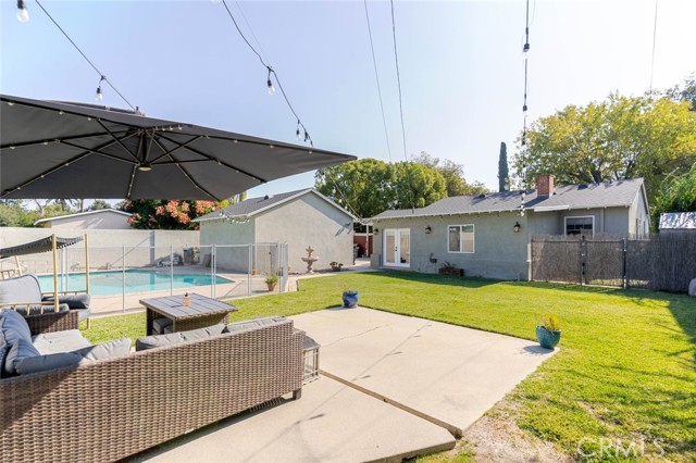 Enjoy the convenience of a dedicated laundry room and the charm of double doors that open to a private backyard oasis. Outside, you'll find a sparkling pool, a lush lawn, a paved patio area perfect for outdoor dining, and a detached two-car garage.