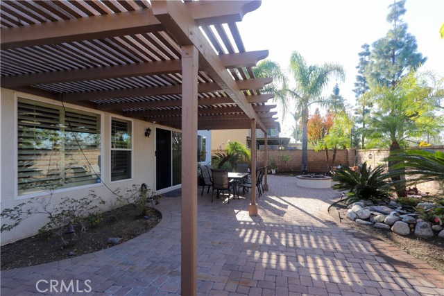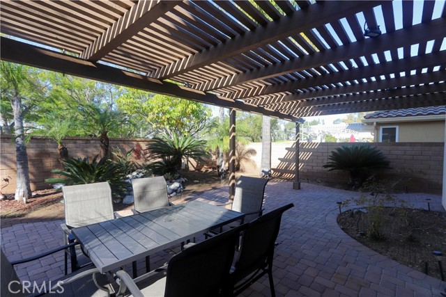 Entertainer’s backyard with custom patio cover, gas firepit, and decorative waterfall/fountain. 3-car garage with built-in cabinets & epoxy flooring, with additional laundry hookups. Tiled roof, with rain gutters.