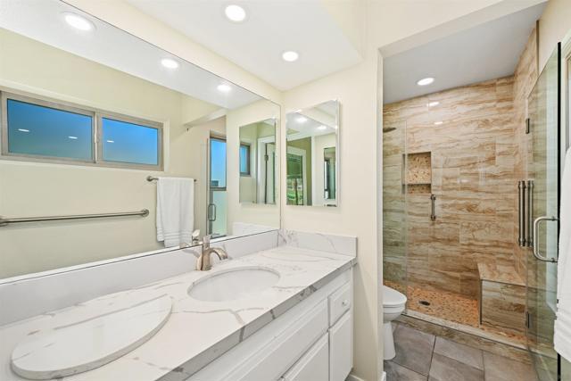 Premium location situated directly on the beautiful Oaks North Golf Course, this single-story home offers panoramic golf course views on a quiet cul-de-sac in the highly desirable 55+ Oaks North neighborhood. Enter and gaze upon soaring high vaulted ceilings, open floor plan with lots of light creates an inviting atmosphere. Recent renovations include a gorgeous open kitchen with quartz countertops, stainless steel Thermador appliances, garden window, bar seating, nook and formal dining areas. A spacious living room with a fireplace is ideal for relaxing or entertaining. Upgrades also include luxury vinyl plank flooring, recessed lighting, HVAC system, water heater and quartz countertops in the primary bathroom, secondary bathroom and hallway cabinet, the primary bathroom also showcases a walk-in shower with stone-look tile and pebble accents. Meander outside to a generous patio with a new aluminum pergola—perfect for relaxing, dining, or entertaining while taking in the serene golf course scenery. The easy care yard has a bounty of fruit trees including Valencia orange, grapefruit and lemon. Additional highlights include an indoor laundry (washer/dryer included) and attached 2-car garage. Residents of Oaks North enjoy access to the Oaks North Community Center offering multiple social and recreation activities including a community pool, tennis courts, pickleball, lawn bowling, exercise room, billiards, library etc. With close proximity to the Rancho Bernardo Inn, Bernardo Winery, golf courses, shopping, and dining, this home truly has it all!