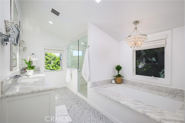 The home’s interiors unfold with purpose and elegance. A custom chef’s kitchen serves as the heart of the home, showcasing a statement island and premium finishes, while the sunlit living room is centered around a dramatic stone fireplace rising from floor to ceiling. Upstairs, the expansive primary suite creates a private retreat spanning the entire level—an oasis of calm, comfort, and refined design.