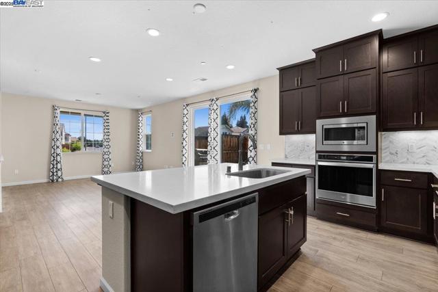 Welcome to 4384 Lennox Lane, a beautifully upgraded smart home in Tracy's desirable Brookview neighborhood within the top-rated Jefferson School District. Built in 2019, this 3-bedroom, 2.5-bath residence offers 1,814 sq ft of modern living on a spacious 5,541 sq ft corner lot with new carpet and paint throughout. The open-concept layout features a gourmet kitchen with a large island, chevron-tile backsplash, and stainless appliances, flowing seamlessly into the living and dining areas with luxury vinyl plank flooring. Upstairs, the serene primary suite boasts two walk-in closets, a soaking tub, and dual sinks. Enjoy smart home features including Ring doorbell, Nest thermostats, smart sprinklers, Wi-Fi-enabled garage and washer, plus EV charger readiness. The beautifully landscaped backyard with raised planter beds is perfect for relaxing or entertaining. With no HOA or Mello-Roos, and proximity to ACE train and parks, this move-in-ready home offers style, convenience, and value.