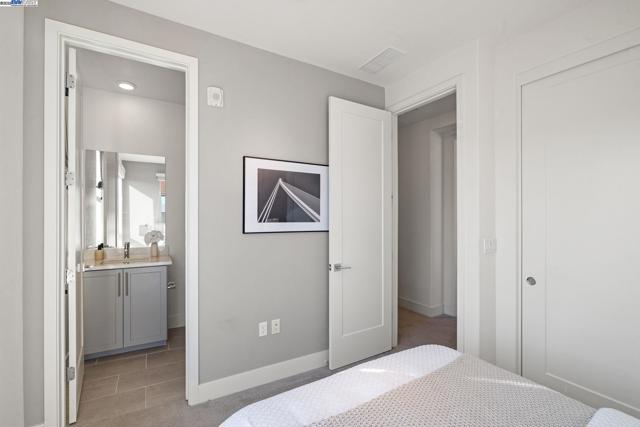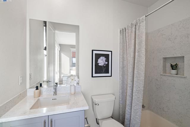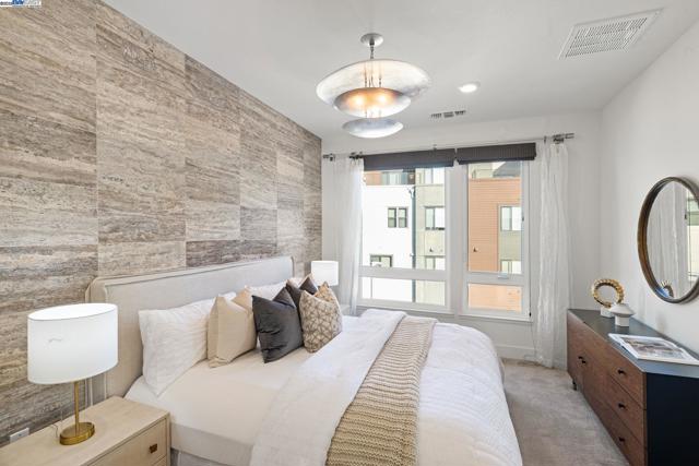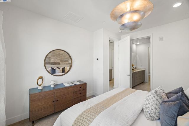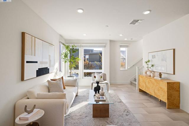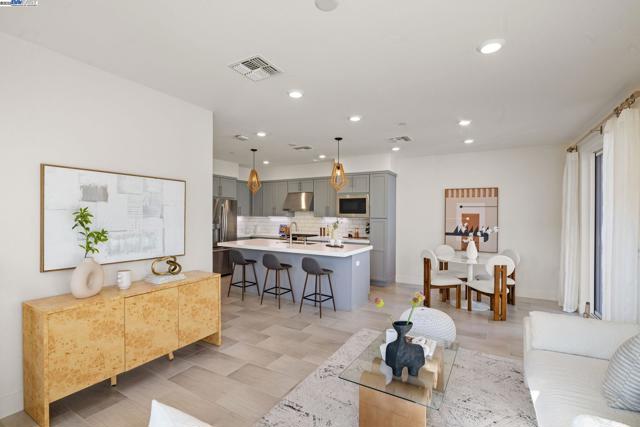 Built in 2020 and presenting like new, this upgraded 2-bedroom, 2.5-bath townhome in Fremont’s Innovation community offers modern finishes and outstanding convenience. The bright main living area features large windows, recessed lighting, and an open layout connecting the living, dining, and kitchen spaces. The kitchen includes quartz countertops, a large island, soft-close cabinetry, stainless steel appliances, and designer pendant lights. A private balcony extends the living space. Both bedrooms function as suites, with the primary offering a walk-in closet, accent wall, and an upgraded bath with dual vanities and a walk-in shower. The secondary suite includes its own full bath, ideal for guests or flexible use. Additional highlights include upgraded flooring, dual-pane windows, dual-zone heating and cooling, EV-ready charging in the garage, in-unit laundry, and an attached garage. The home is steps from Innovation’s resort-style amenities, including pools, cabanas, fitness center, clubhouse, fire pits, and outdoor dining areas. Lila Bringhurst Elementary is located approximately 0.1 miles away, adding exceptional neighborhood convenience. Close to Warm Springs BART, Tesla, Pacific Commons, and major commuter routes, this home blends comfort and accessibility.