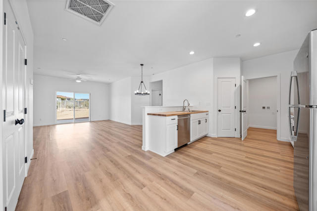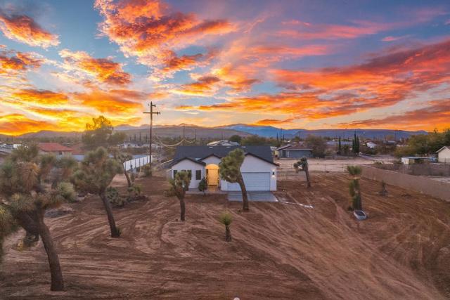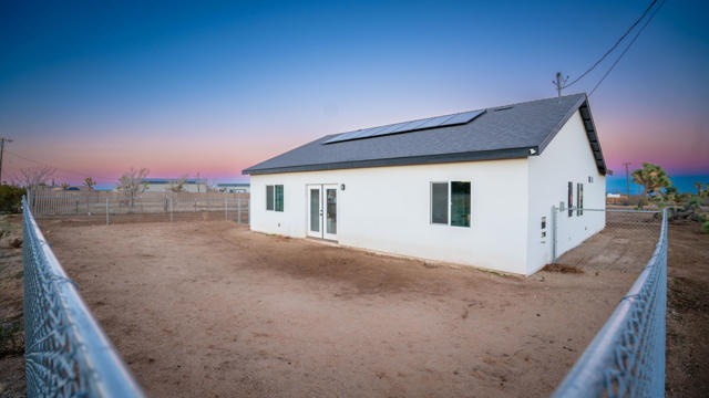 Welcome home! This beautiful newly built 4-bedroom, 2-bath modern farmhouse-style home, with fully paid solar completed in 2023, is the complete package of style, comfort & value. This homes checks all of the boxes. This wonderful property sits on a spacious, open lot just off a paved road and features a perfect collection of mature Joshua Trees, adding charm and capturing the true essence of desert living.Designed for both comfort and efficiency, this home is fully electric, equipped with paid-in-full solar, Title 24 compliant construction, and high R-value insulation--all contributing to exceptional energy efficiency and low utility costs. Located within walking distance to local schools and offering central heating and air conditioning, this home delivers modern convenience in a serene desert setting.Inside, the kitchen features stainless steel appliances, while sleek black fixtures and hardware provide a stylish, cohesive look throughout. Enjoy generously sized bedrooms, ceiling fans, a well-appointed laundry room, and an inviting open floor plan ideal for everyday living and entertaining. Durable laminate flooring flows throughout, enhancing the home's clean and contemporary aesthetic.The fully fenced backyard offers ample space--perfect for pets, recreation, or future customization. With plenty of potential to add your own creative touches, this home is priced right, beautifully finished, and move-in ready. An impressive offering with exceptional value. Come make it yours today.Buyer and buyer's agent to independently verify all information, including but not limited to permits, square footage, property features, and intended use.'