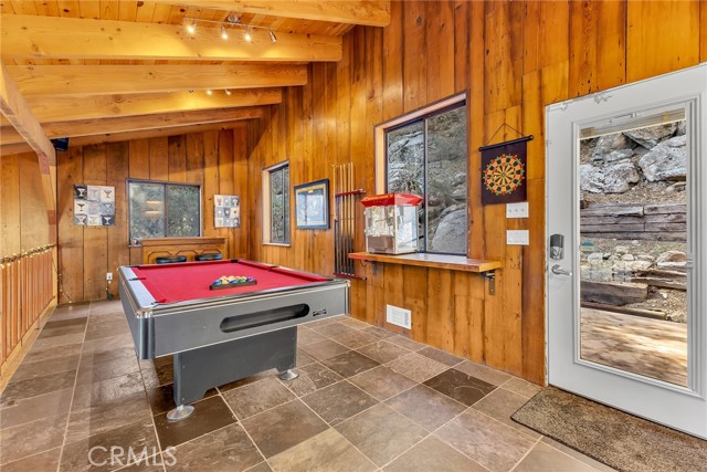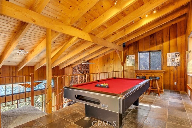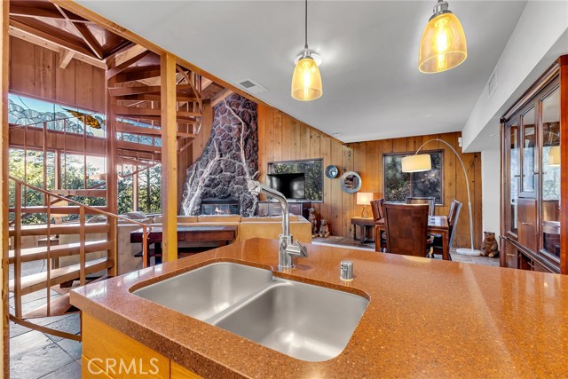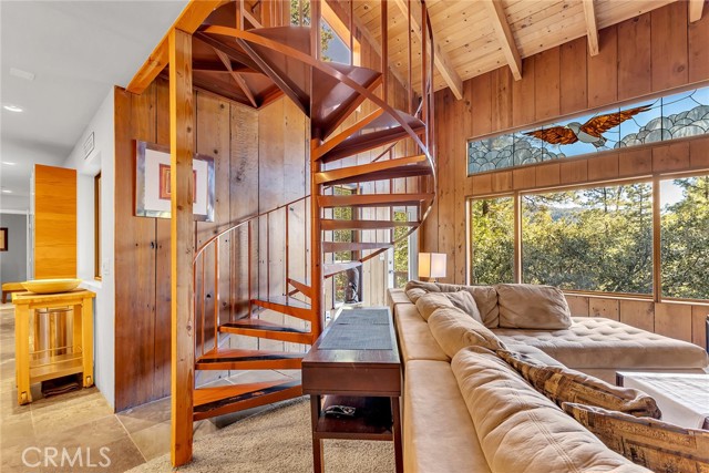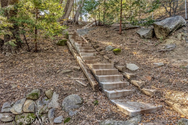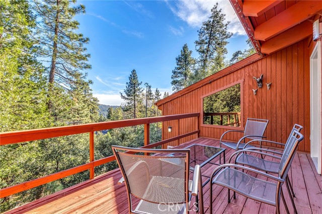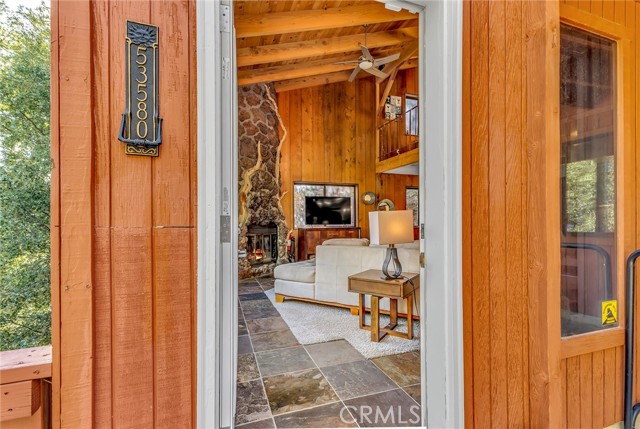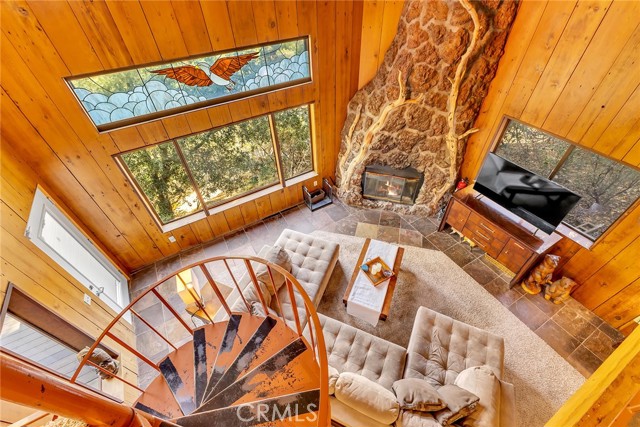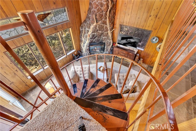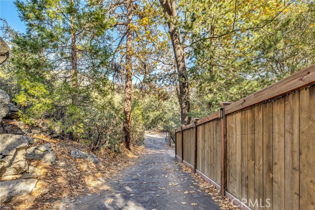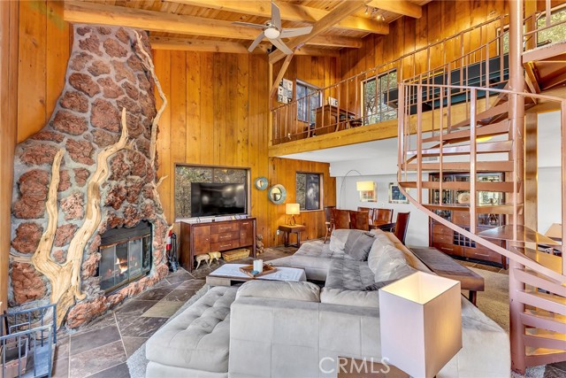 Sited high above the street in the quiet Cedar Glen neighborhood, this warm and inviting mountain home is surrounded by towering pines, dramatic boulders, and a peaceful sense of retreat. Thoughtfully remodeled and designed for comfort, the main level welcomes you with an open living space anchored by a striking floor to ceiling rock fireplace crafted with sculpted manzanita branches. Vaulted ceilings and large windows fill the room with soft natural light, creating a true treetop atmosphere. The living, dining, and kitchen areas blend together with an easy, connected flow. The kitchen features custom cabinetry, quartz counters, stainless appliances, and a breakfast bar perfect for casual meals or gathering with friends. Stained glass windows facing southeast add warmth, color, and morning glow to the space. A comfortable bedroom and bath on this level allow for simple single level living, and the main deck offers an ideal spot for relaxing in the forest setting. A spiral staircase leads to the upper floor, where the home opens into several flexible, welcoming spaces. A generous game room with a wet bar offers an enjoyable area for entertaining or weekend fun. Just beyond, a secluded sitting area provides a peaceful space for a home office, reading nook, or additional sleeping area as needed. This sitting area opens to a private front deck perched above the trees. The upstairs bedroom enjoys direct access to the expansive backyard patio, framed by pines and natural rock formations, and offers convenient access to the upper parking area from Highway 243. The upper level also features a spa like bath with custom tilework and a spacious tub and shower, creating a calm and restorative place to unwind. A small sleeping loft, accessed by ladder, adds a charming option for guests. The property includes a cargo lift that carries items from the lowest point of the property to the highest, providing practical support for transporting groceries, wood, or supplies. Multiple outdoor living areas, including decks and a large patio, offer a variety of places to enjoy the mountain air. The adjacent .33 acre parcel is also available for purchase, offering natural boulders, mature pines, and potential access from Highway 243. Located near the Nature Center and miles of hiking trails, and just minutes from town, this Cedar Glen home offers an elevated mountain experience with comfort, privacy, and room to gather.