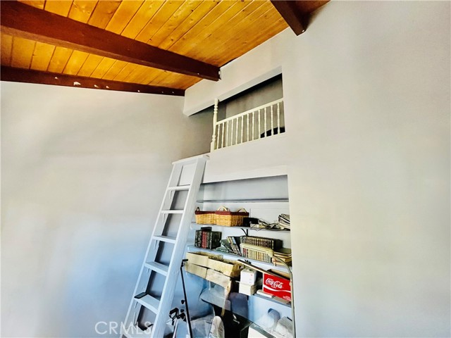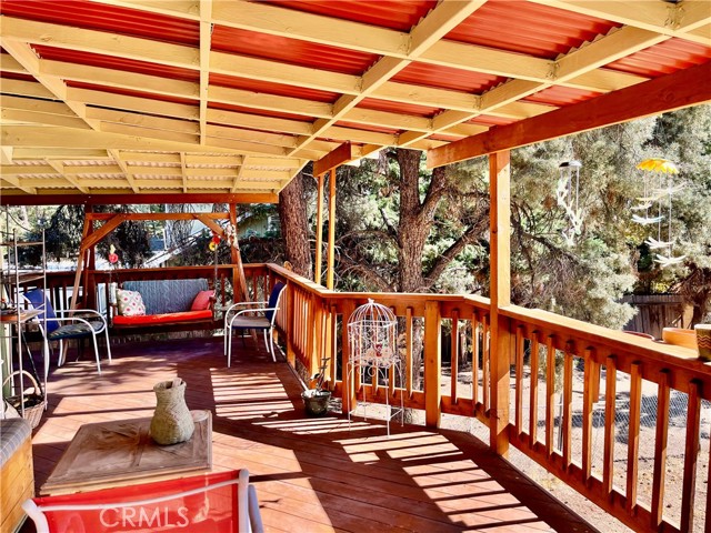 The upper level features a warm and cozy living room with tall vaulted wood ceilings that extend throughout the entire top floor. A set of beautiful double glass doors opens to an expansive wraparound deck where you can enjoy peaceful evenings and take in the views of the distant hills.