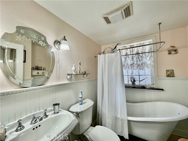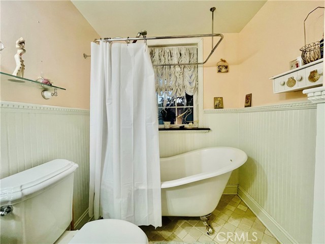 The upper-level bathroom offers true vintage charm with a clawfoot tub, pedestal sink, wainscoting, and tile flooring. Two bedrooms are located on this level, one of which includes a bonus loft area for extra storage.