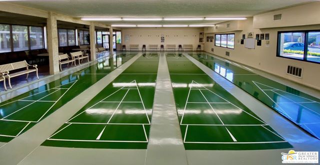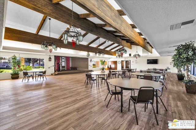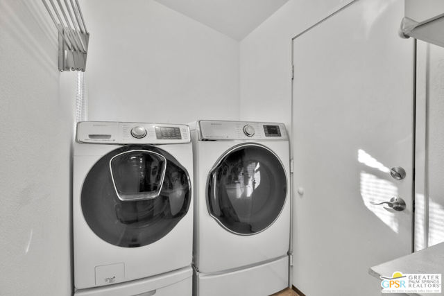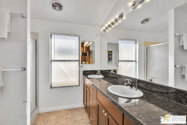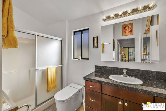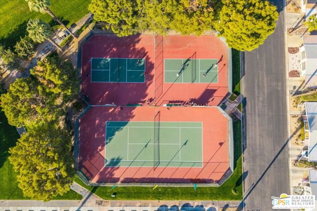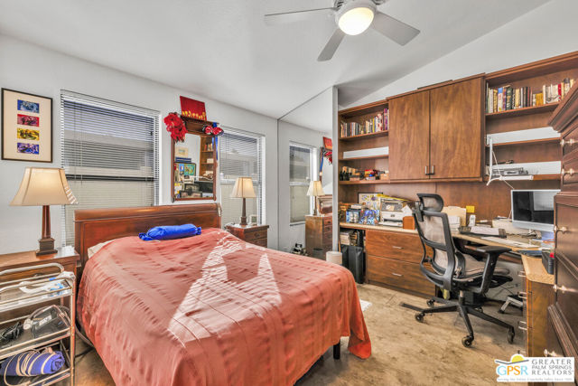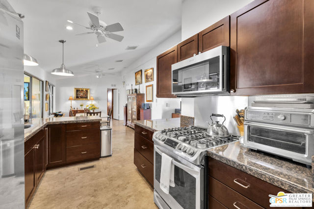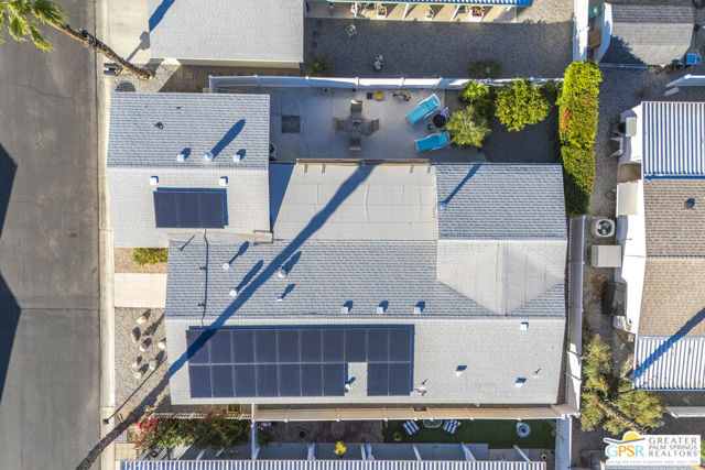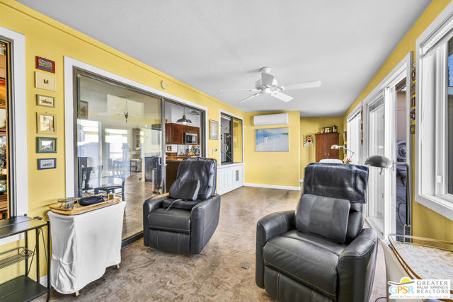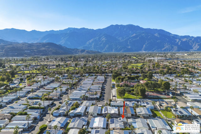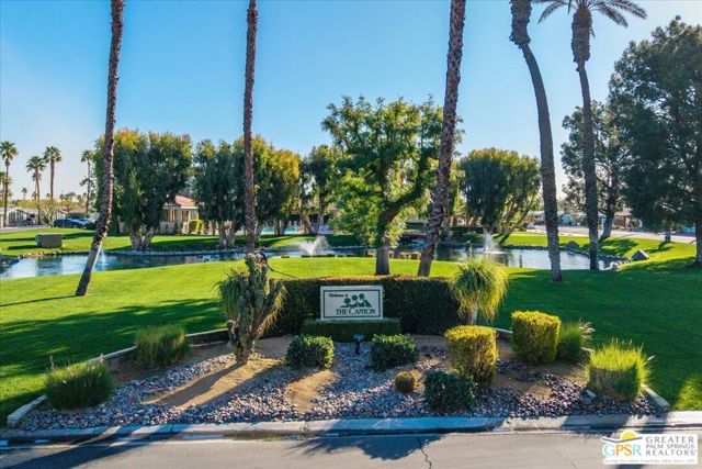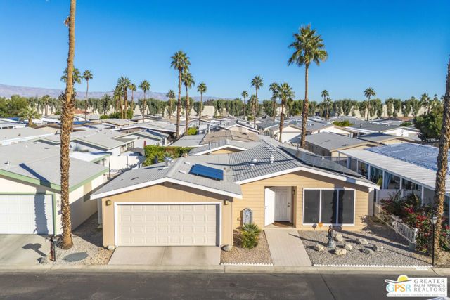 Location + Garage + Solar = A fantastic opportunity at The Canyon, one of the area's most desirable mobile home communities. This spacious 2 Bed / 2 Bath home with a bonus sunroom offers 1,558 sq. ft. of comfortable, well-maintained living space. With drywall throughout, recent updates include: new water heater, garage door, and garage insulation (2024) - new kitchen appliances; gas range, refrigerator, microwave, and dishwasher (2020) - new AC coil and furnace (2021) - new AC/heater mini-split in sunroom, new electrical panel, and patio misting system (2019). From the cozy living room, take in the mountain views and gorgeous desert sunsets. The kitchen features granite tile countertops and custom cabinetry. The large primary bedroom with ensuite bath creates a private retreat within the home. The primary and guest baths both offer granite countertops and custom cabinetry, with the primary bath featuring dual sinks. The bonus sunroom offers versatile possibilities and features a gas fireplace. Energy efficiency is a highlight with 20 leased solar panels installed in 2020 by Sunrun, and a vented evaporative cooler, helping keep energy bills low. Enjoy the convenience of the laundry room adjacent to the attached two-car garage. Outside, the private, fenced backyard includes an electric patio awning and two mature citrus trees. Community amenities at The Canyon include two sparkling heated pools and spas, tennis & pickleball courts, a welcoming clubhouse with library/card room, billiard/game room, fitness room, crafts room, indoor shuffleboard, and a beautiful multi-function room with a stage and professional-style kitchen, ideal for events. This home is conveniently located on a quiet street, just one block away from the clubhouse. The Canyon is a gated, well-maintained 55+ community. Buyers must obtain park approval, which requires a minimum 750 credit score and proof of income three times the monthly space rent of $995. One pet up to 20 lbs is permitted. Buyers and their agents to verify current space rent and square footage. With PSP Airport, shopping, and restaurants just minutes away, this home is perfect for year-round living or as a vacation retreat.