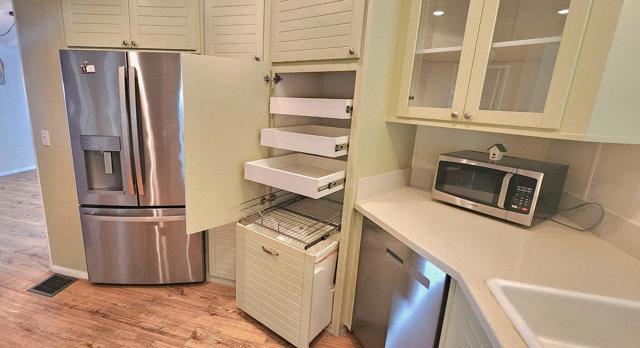 This pristine property is meticulously maintained and move-in ready for new owners. The expansive two-bedroom, two-bath floor plan creates an open and inviting ambiance, complemented by vaulted ceilings and dual-pane windows that provide ample natural light. The renovated kitchen comes with Quartz countertops, ample storage, and top-quality stainless-steel appliances, a great space for both entertaining guests and enjoying meals at home. The living area is set up for comfort, and the wet bar makes hosting social events easy. Master suite serves as a peaceful retreat with its private ensuite bathroom, walk-in shower, dual sink vanity, custom cabinets, and direct access to a spa for relaxation. The second bedroom is ideal for visitors, guest bath has been fully updated in a tasteful style. The home sits on a generous lot within a sought-after, private neighborhood near the clubhouse, main gate, and all amenities of Palm Desert Greens Country Club. This active 55+ community sits at the heart of the desert, close to premier golf courses, hiking trails, restaurants, shopping, and casinos. Ownership includes the land, and the $400 monthly HOA fee covers 24/7 guard-gated security, cable, internet, trash collection, FREE GOLF, and much more!