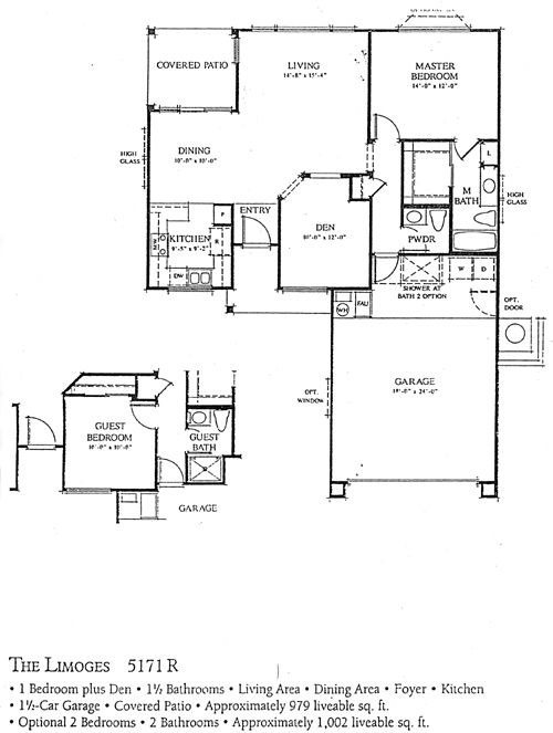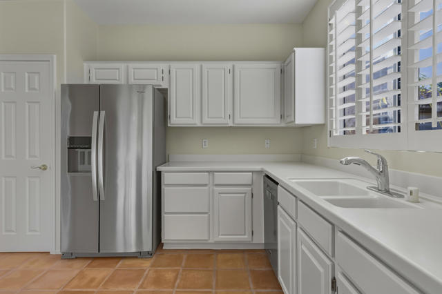 Sun City Palm Desert - Limoge. Beautifully appointed and perfectly located, this home sits in one of Sun City's most desirable neighborhoods--where the HOA maintains the common-area landscaping, stucco, and roof for truly carefree living. Just a short distance from both the Mountain View and Sunset View Clubhouses, the property offers convenient access to the community's premier amenities. Positioned along a lush greenbelt, the north-facing rear patio provides a peaceful setting for relaxing or entertaining amid mature landscaping. A gated, south-facing front courtyard adds curb appeal and an additional outdoor living space. Inside, Saltillo tile flooring and plantation shutters create warm, timeless character. Transom windows and a leaded-glass front door fill the home with natural light. The interior has been freshly painted, including the kitchen cabinets, and the kitchen features corian counters and stainless appliances. The spacious living room opens to the rear patio, while an adjoining den/office can serve as a third bedroom. The primary suite offers a bay window, a large mirrored wardrobe closet, and an en-suite bath with dual sinks and a glass-enclosed stall shower. The guest bathroom includes a tub/shower combination, with both baths finished in cultured marble. Additional highlights include a two-car garage with built-in storage and a utility sink, plus a newer AC (2018).