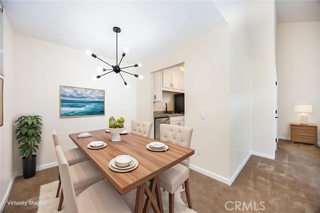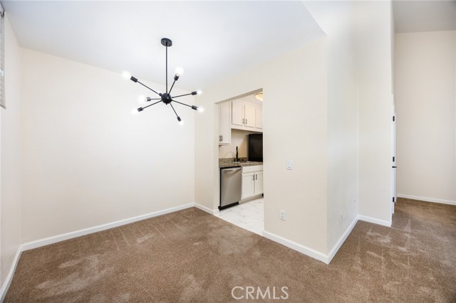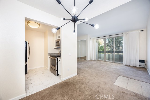 The thoughtfully designed floor plan allows for defined living, dining, and sleeping areas, maximizing functionality without wasted space. The updated kitchen features white cabinetry, granite countertops, and stainless steel appliances, seamlessly connecting to the dining area for everyday convenience. A spacious mirrored closet provides ample storage, while neutral finishes and plush carpeting create a clean, inviting atmosphere throughout.