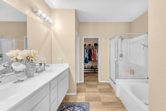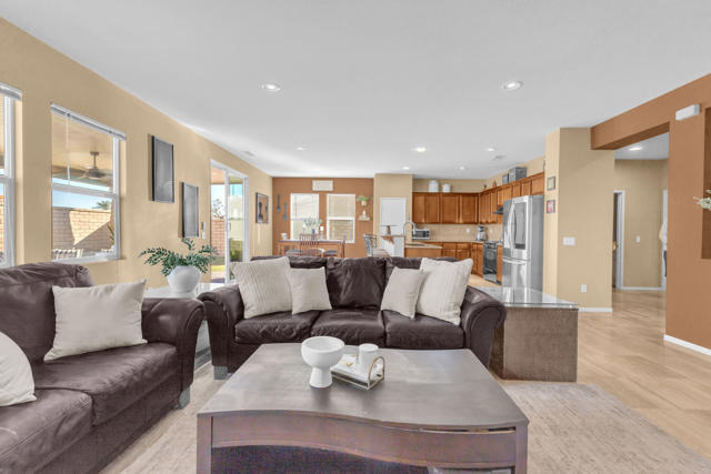 This beautifully upgraded home features soaring 9-foot ceilings and elegant 18'' natural travertine tile flooring installed in 2015, creating a timeless and luxurious feel. Guest bedrooms offer newer carpet installed in 2023 for added comfort. The outdoor living space is thoughtfully designed with a custom Alumiwood awning (2023), a large high-end outdoor ceiling fan, recessed lighting, and striking stone pillars. Sleeving has already been installed inside the stone columns for a future misting system (not visible), along with an electric outlet ready for string or holiday lighting. A custom metal side gate and man door, both installed in 2023, add functionality and security.Bonus extras included for future projects: additional travertine tiles, a full pallet of faux exterior stone blocks, and plans for a swimming pool--offering incredible potential to further enhance this exceptional property.
