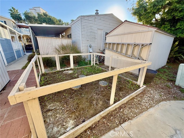 The large lot features a generous back patio with barbecue area, garden space, carport parking, outdoor storage sheds, and convenient access to the community beach gate.