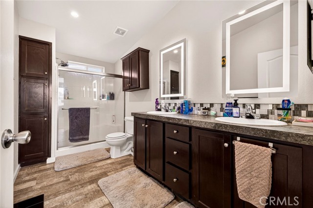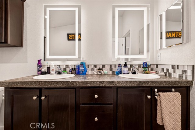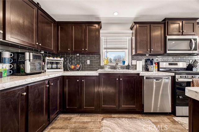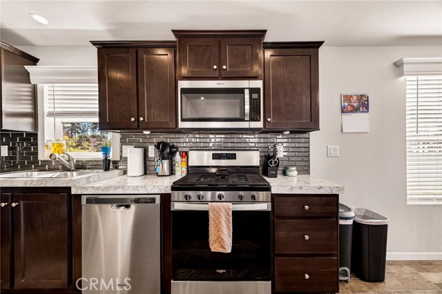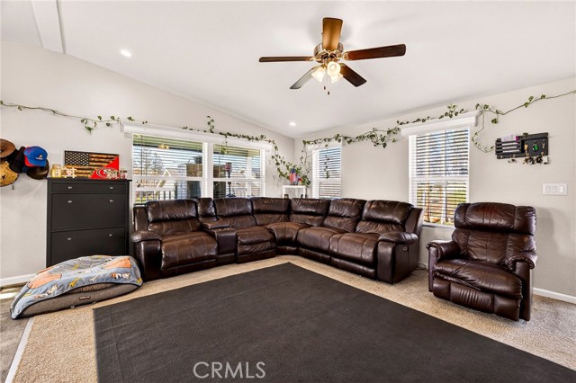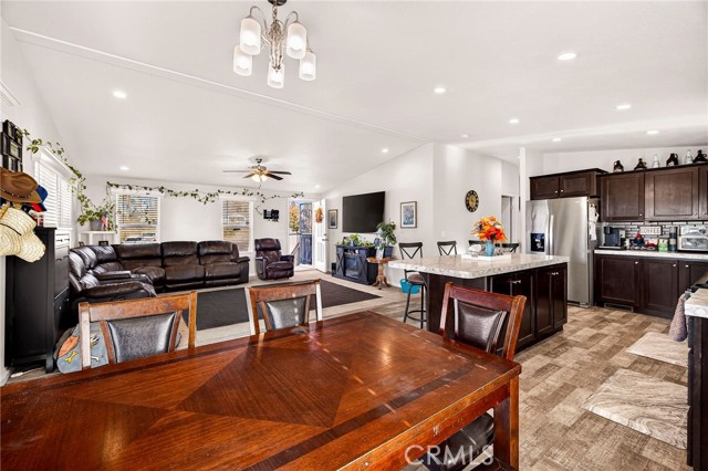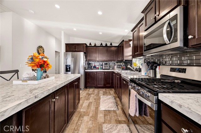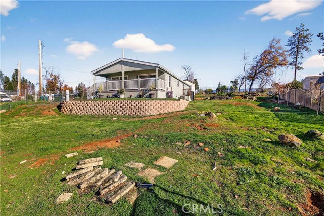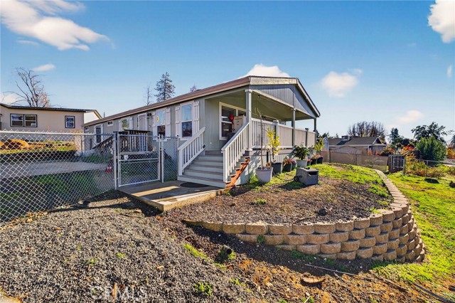Tucked away at the end of a cul-de-sac, this beautiful 3-bedroom, 2-bath home is full of upgrades and room to let your creativity soar. Step inside to a spacious living area with recessed lighting and a ceiling fan, seamlessly flowing into an open-concept kitchen. Admire the authentic tile backsplash, large island, generous storage, and gas stove—plus, the refrigerator stays! Down the hall are two guest bedrooms with ample closet space, and a large laundry room with extra storage or space for a deep freezer. Additional hallway cabinets provide even more storage. The guest bath offers a tub/shower combo for versatility. The primary suite boasts a walk-in closet, ceiling fan, and bathroom with a walk-in shower, dual sinks, lighted mirrors, and elegant tile work. Outside, a sliding glass door leads to a spacious composite deck with stunning sunset views. The fenced backyard includes a drive-through gate, and the property is enhanced with orange, peach, maple, redwood, and oak trees. With newer gutters, underground utilities, extra parking, and RV hookups, this home truly has it all.