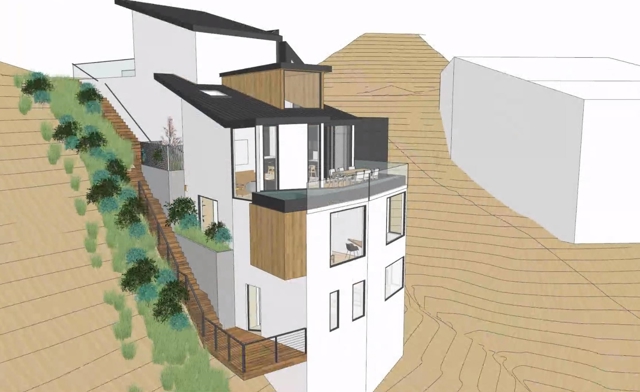 Downslope with direct views of downtown San Francisco. Design review approved plans. The next step is construction drawings for a building permit.