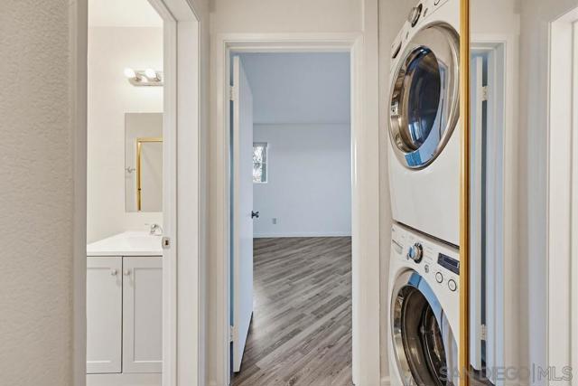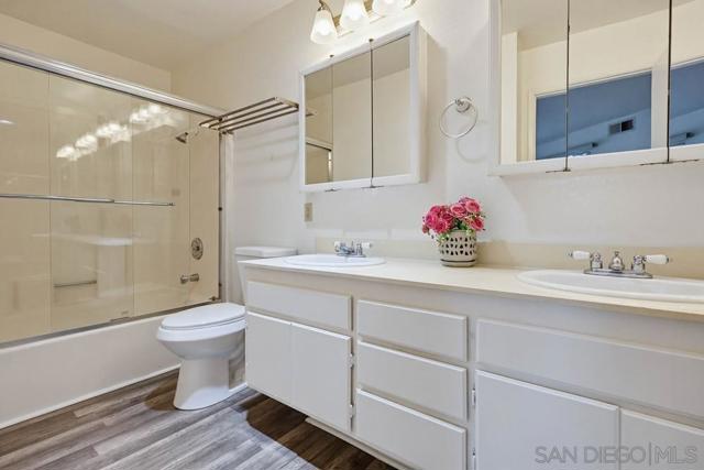 Spacious and well-maintained 3-bedroom, 2-bathroom condominium in prime hilltop location overlooking Mission Valley. This open, airy home features nearly floor-to-ceiling sliding glass doors leading to a private covered patio - accessible from the primary bedroom, secondary bedroom, and expansive living area with cozy fireplace - creating effortless indoor-outdoor living. The patio features a private gate that opens to a stone paver pathway leading directly into the community's landscaped greenbelt and picnic area, ideal for morning coffee, pets or easy outdoor access. Upgraded flooring and a convenient in-unit, closet-stacked washer and dryer enhance the functional layout. This home includes three parking spaces: a private tandem garage plus an additional community parking permit for overnight parking. Community amenities feature a large heated resort-style pool and spa with expansive hard-deck lounge area, BBQ areas, an exercise room and ample guest parking. Monthly HOA dues include water, trash, and common area maintenance. Perfectly situated in a desirable residential neighborhood above Mission Valley, with quick access to Fashion Valley Mall, Snapdragon Stadium, downtown San Diego, beaches, hospitals, airport and area universities and college (USD, SDSU, Mesa).