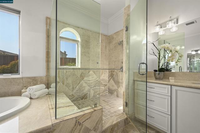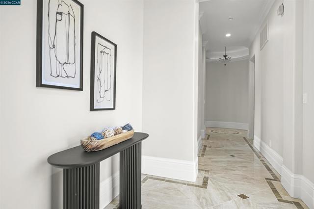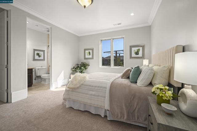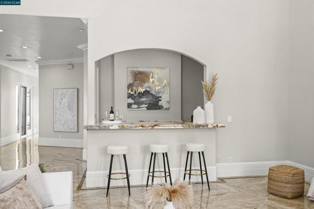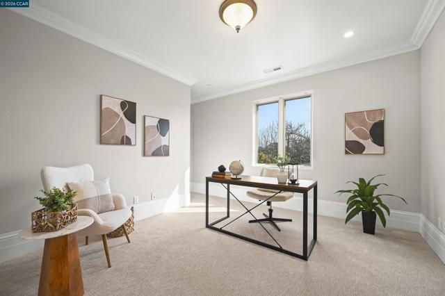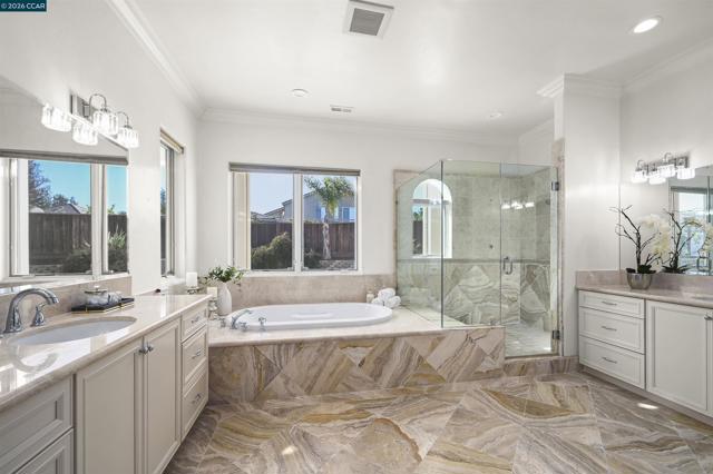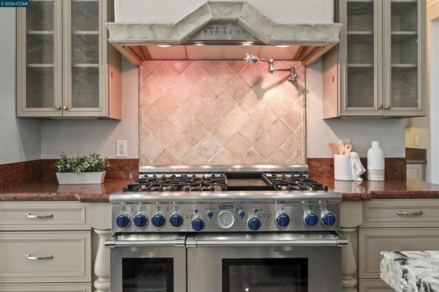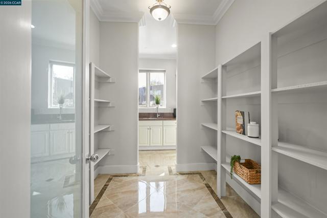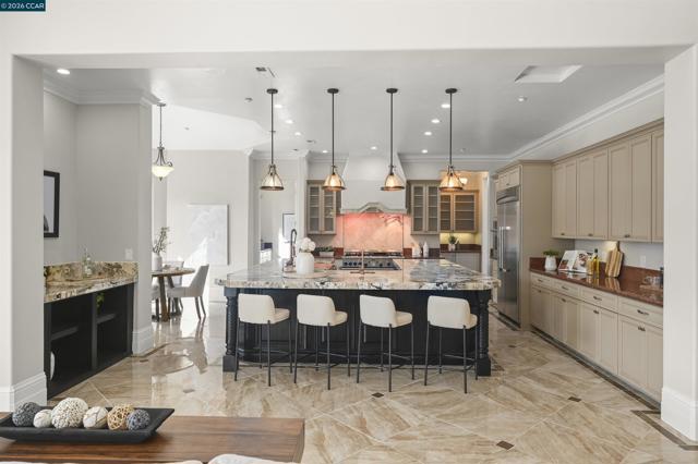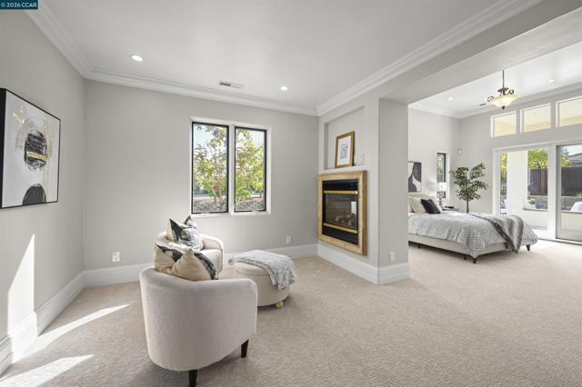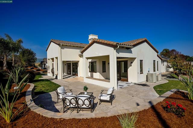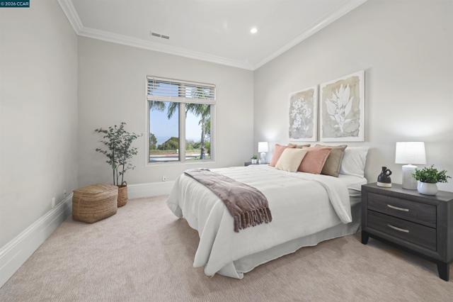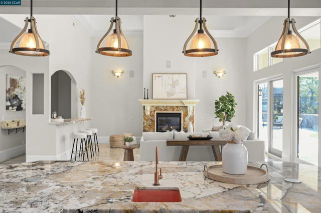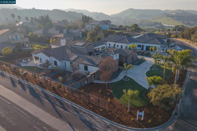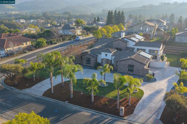 Rarely available luxury single-story estate in prestigious Kolb Ranch Estates, featuring a highly desirable North-facing orientation & stunning Mt. Diablo views. Exceptional curb appeal with a circular horseshoe driveway & dramatic courtyard entry. The well-designed floor plan offers elegant formal living, dining rooms & spacious family room with soaring ceilings, extensive crown molding, & refined finishes throughout. Chef’s kitchen includes a large island with distinctive granite countertops, upgraded copper sinks, professional Thermador SS appliances, spacious pantry, and breakfast nook. The impressive primary suite is a private retreat with fireplace, separate sitting area, spa-like bath with dual vanities, & a walk-in closet with custom built-ins. Four additional bedrooms each feature en-suite baths and walk-in closets. Large laundry room includes a pet shower. The expansive backyard offers lawn space, raised garden beds, and abundant fruit trees. Fully paid Tesla solar with three backup batteries provides exceptional energy efficiency. Quiet neighborhood yet Conveniently located near shopping, freeways, BART, downtown Pleasanton, and top-rated Pleasanton schools. A truly rare opportunity to own a premier single-story estate in one of Pleasanton’s most coveted neighborhoods!